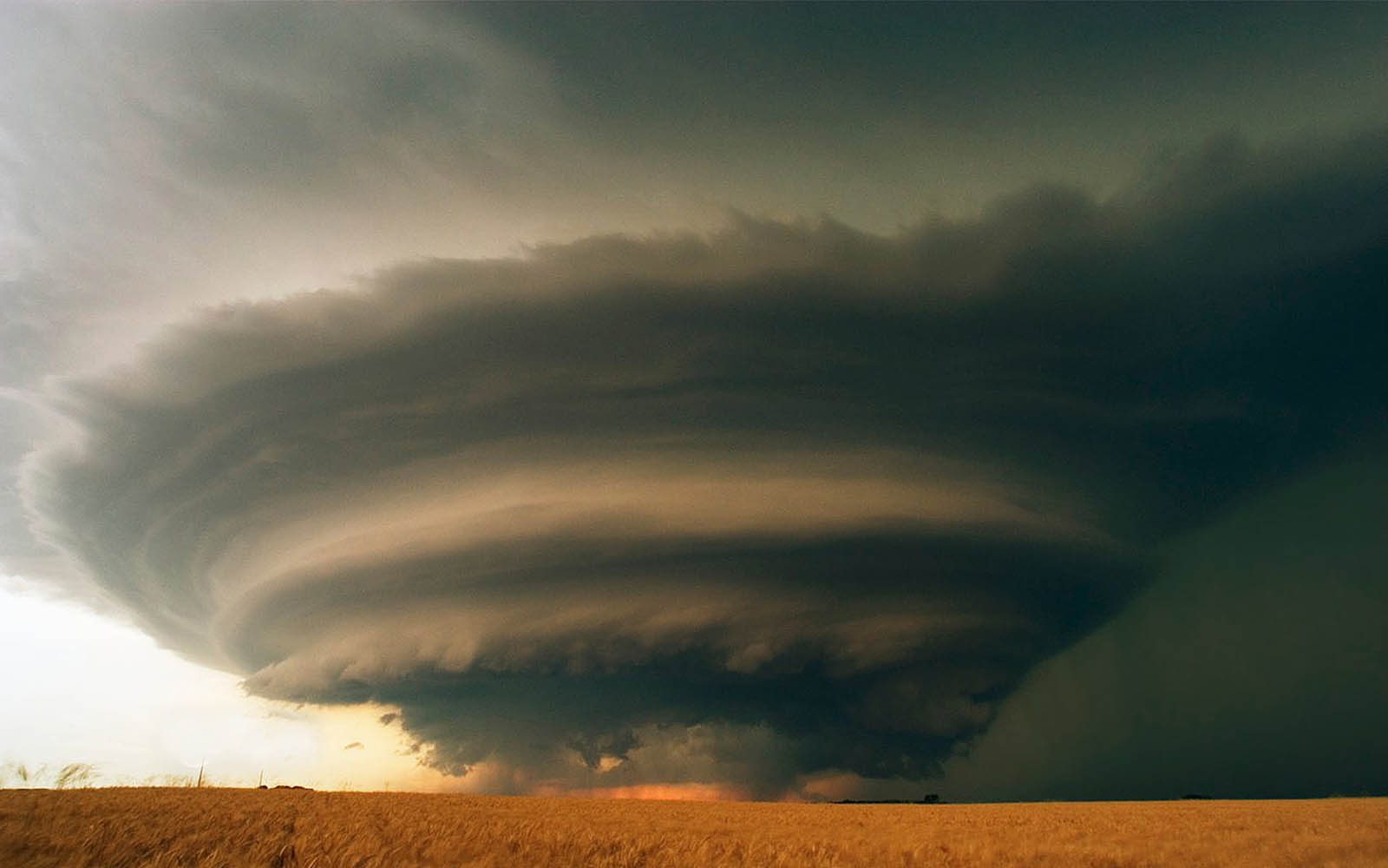 Description: A large cloud is in the sky over a field of wheat as the sun sets in the distance behind it.
