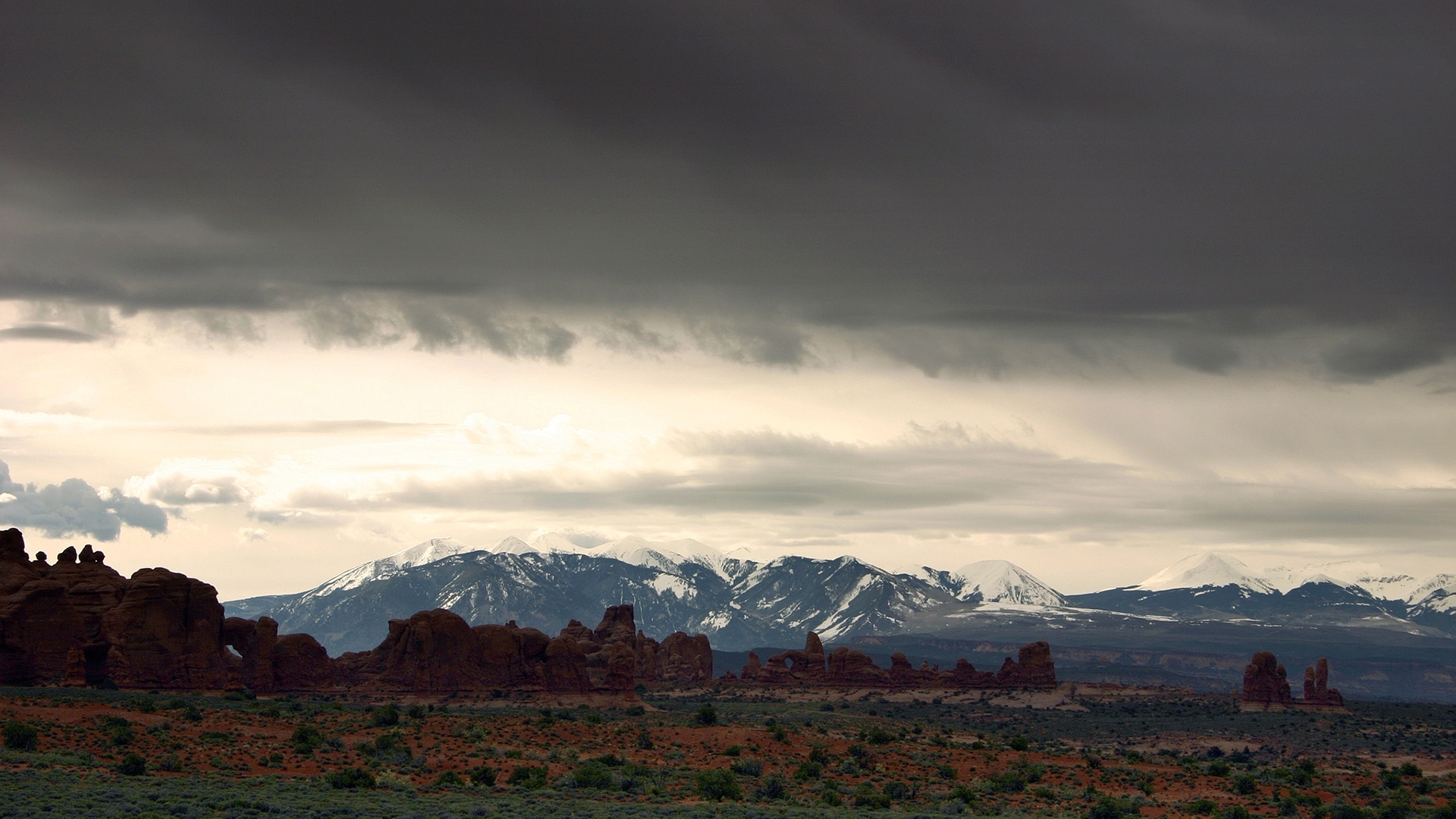 Description: A cloudy sky over a mountain range with a horse in the foreground and a few snow capped mountains in the distance.