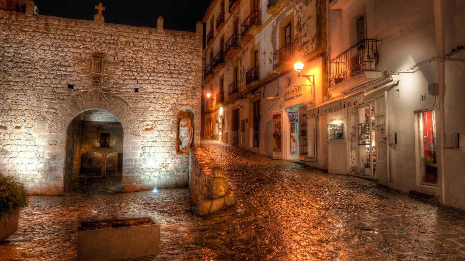 Description: A cobblestone street with a stone building and a doorway at night with lights on the side of the street.
