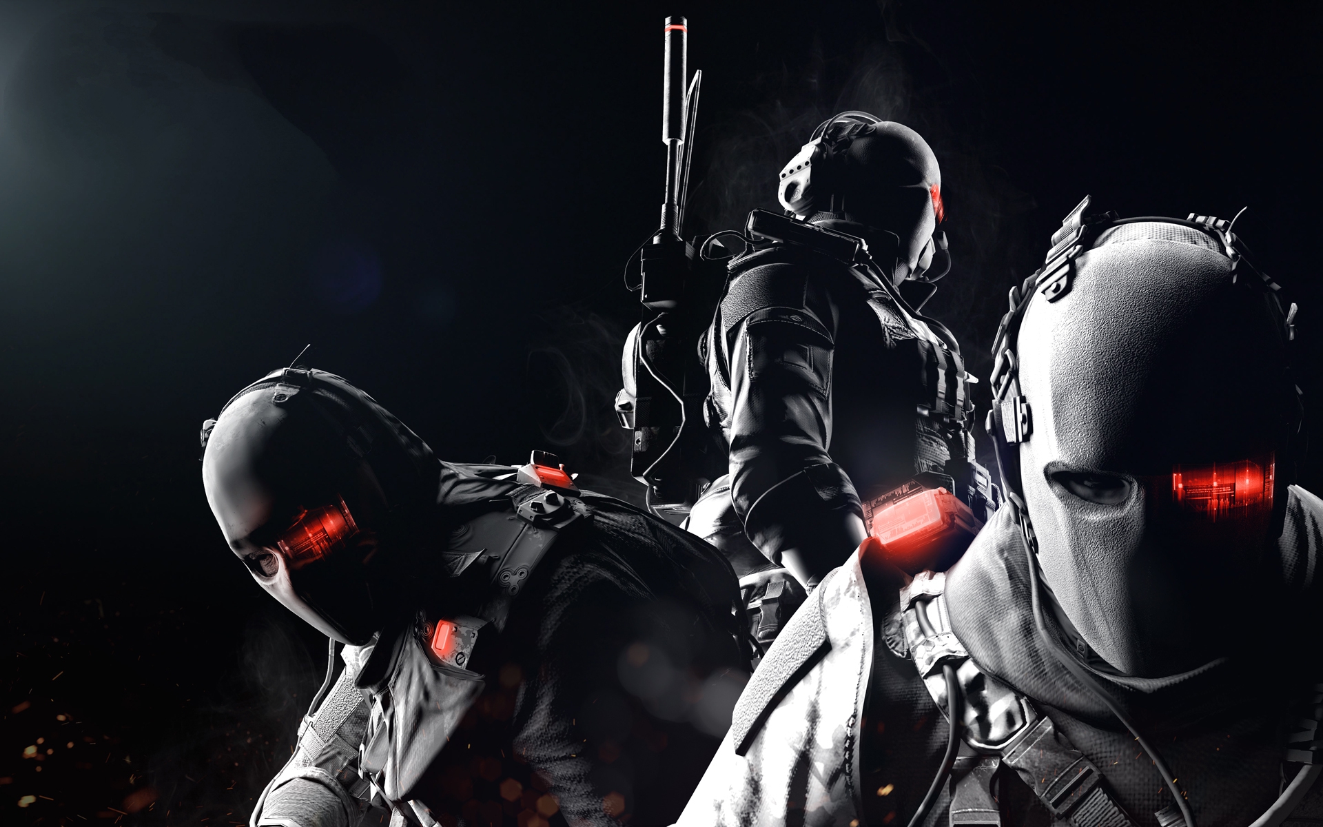 Description: A group of people in black and red outfits with guns in their hands and a flashlight in their hand.