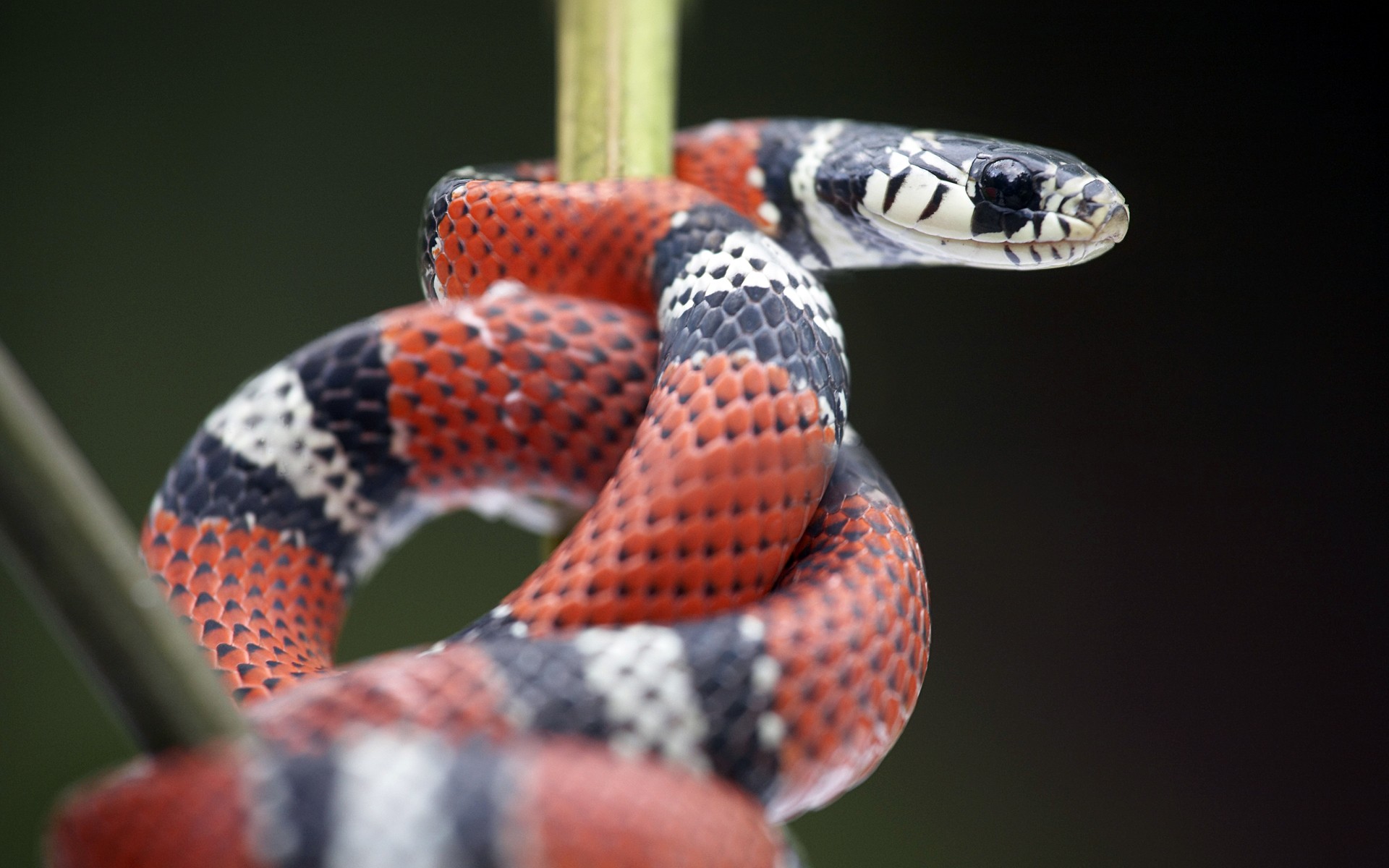 Description: A snake is curled up on a stick with a black background and a white and orange stripe on it.