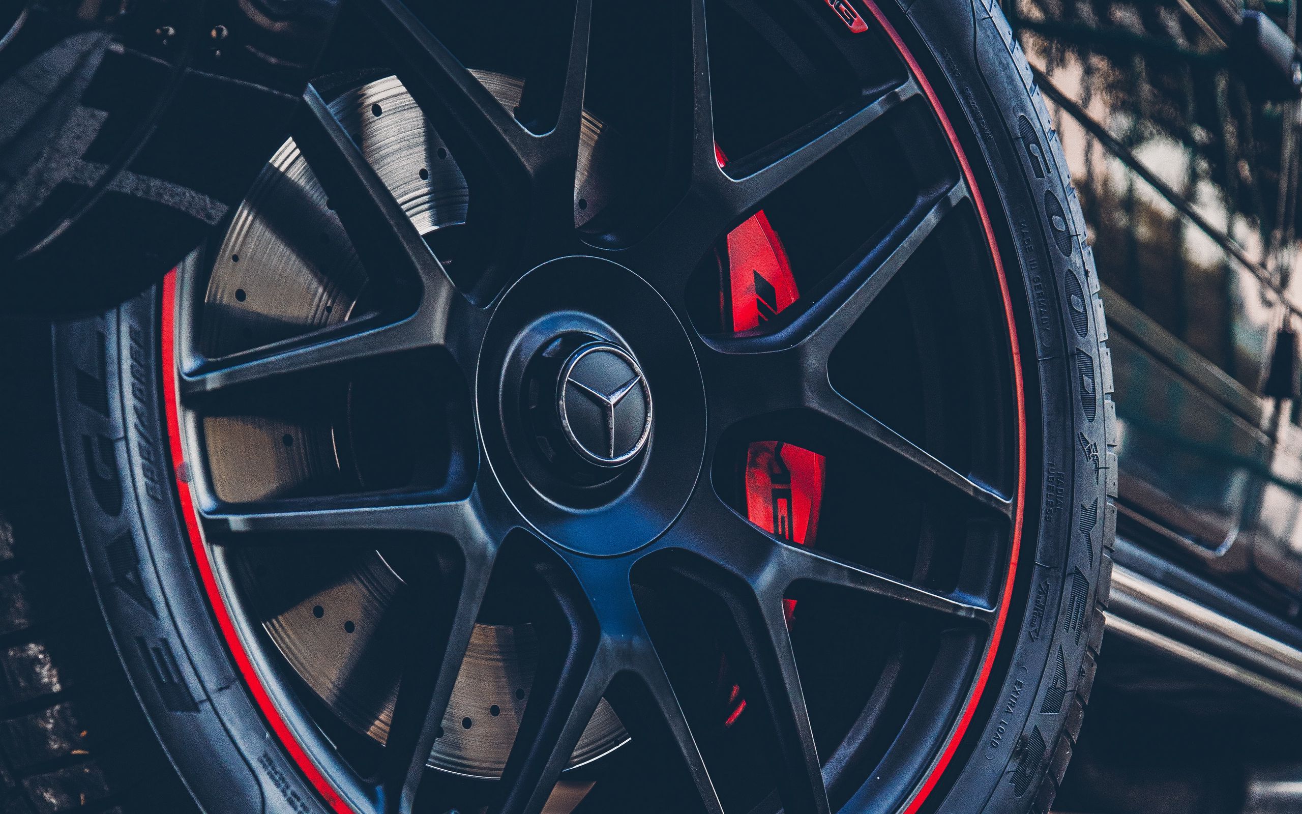 Description: A close up of a tire on a car with red and blue stripes on it's rims.
