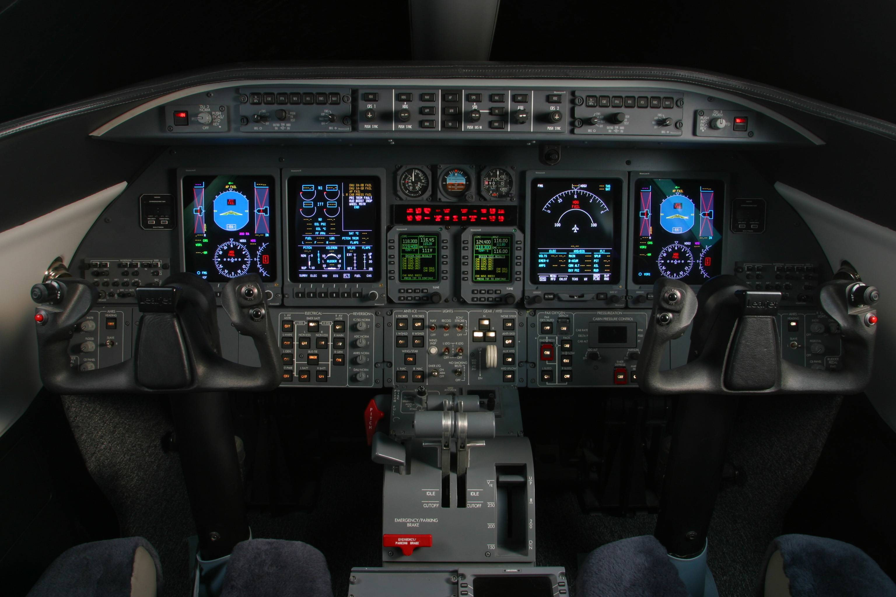 Description: A cockpit with a lot of instruments and lights on it's sides and a few windows on the sides.