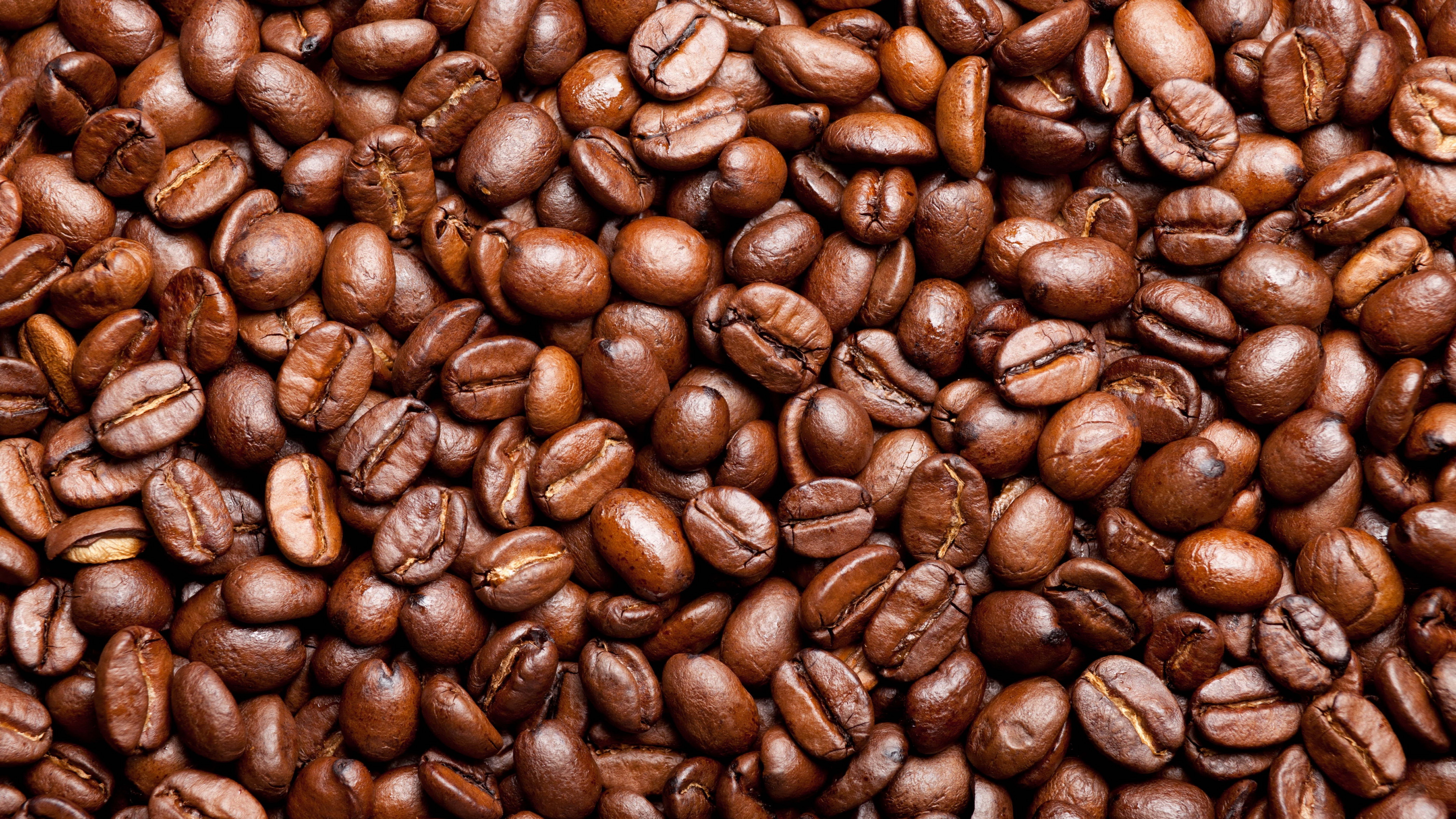 Description: A pile of coffee beans with a brown background and a few brown spots on the beans.