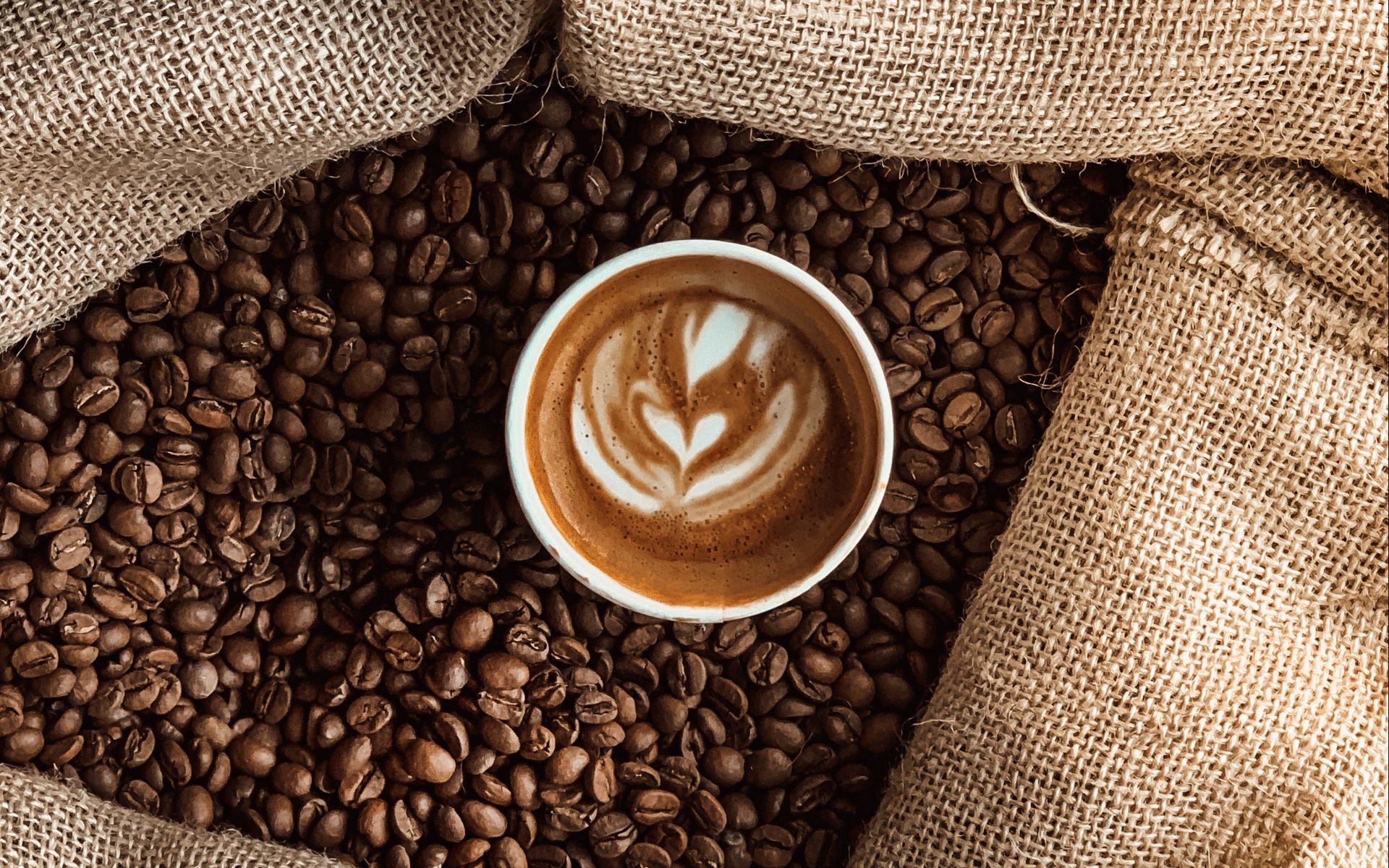 Description: A cup of coffee on a bed of coffee beans with a burlock of coffee beans in the background.