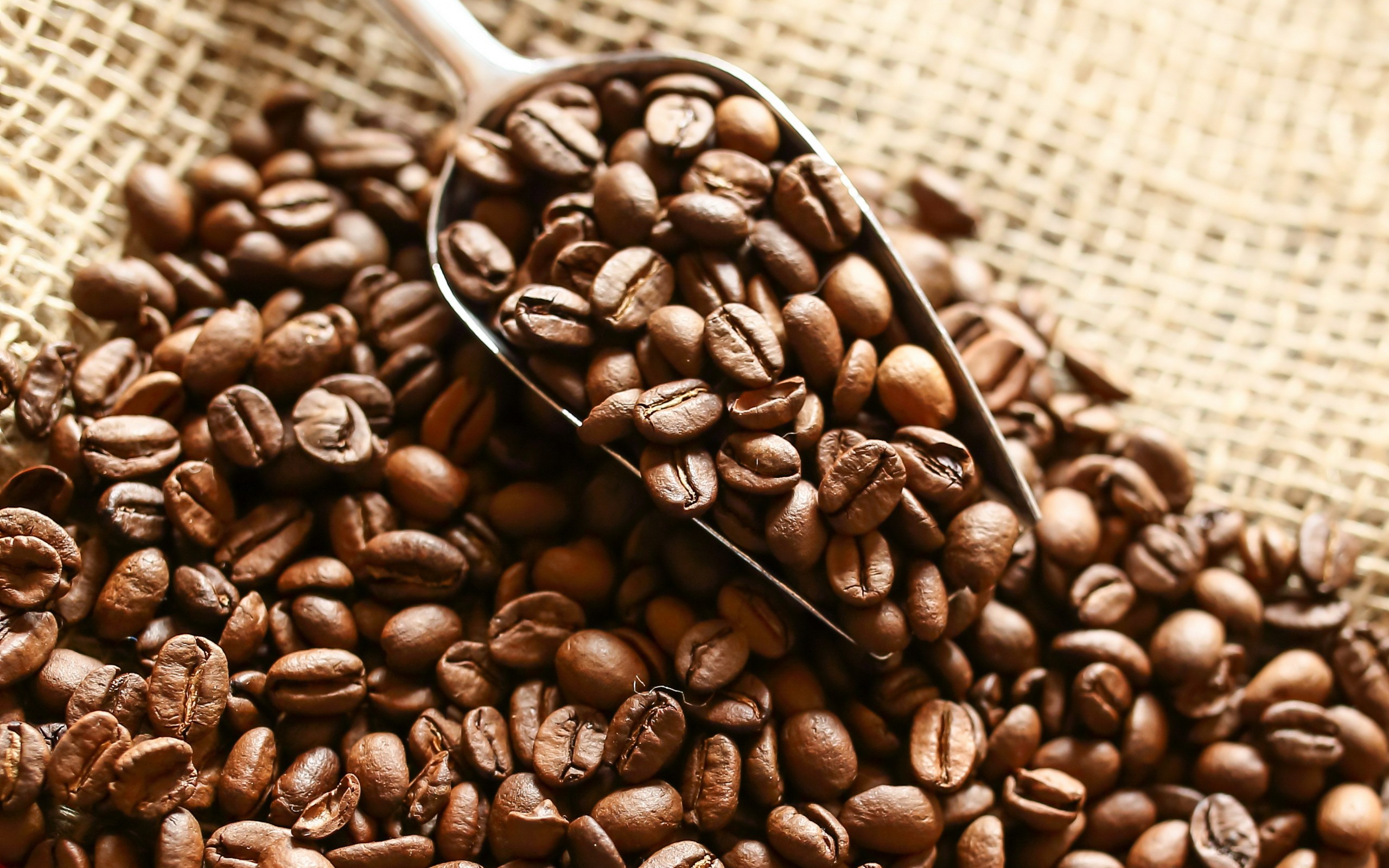 Description: A scoop of coffee beans on a sack of burlap paper with a spoon in it and a sack of burlap paper behind it.
