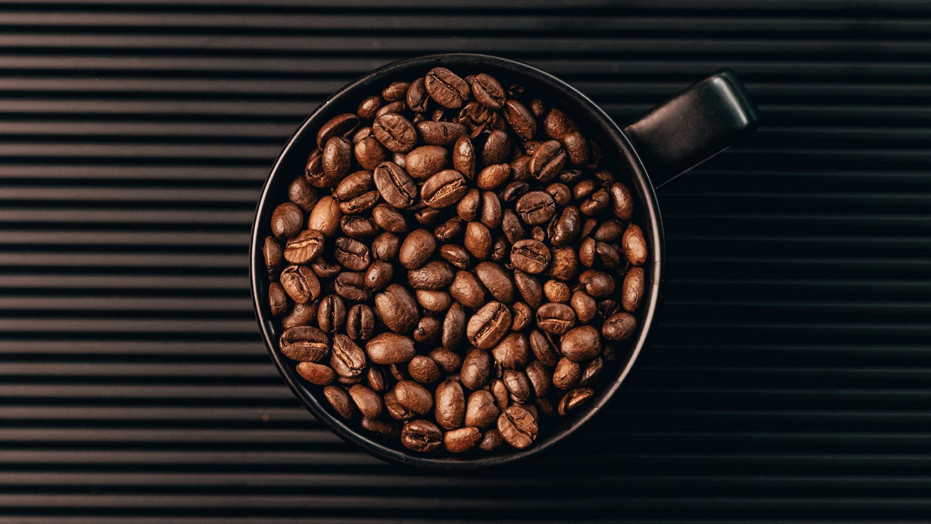 Description: A pan filled with coffee beans on top of a table next to a wall and a black background with a black stripe.