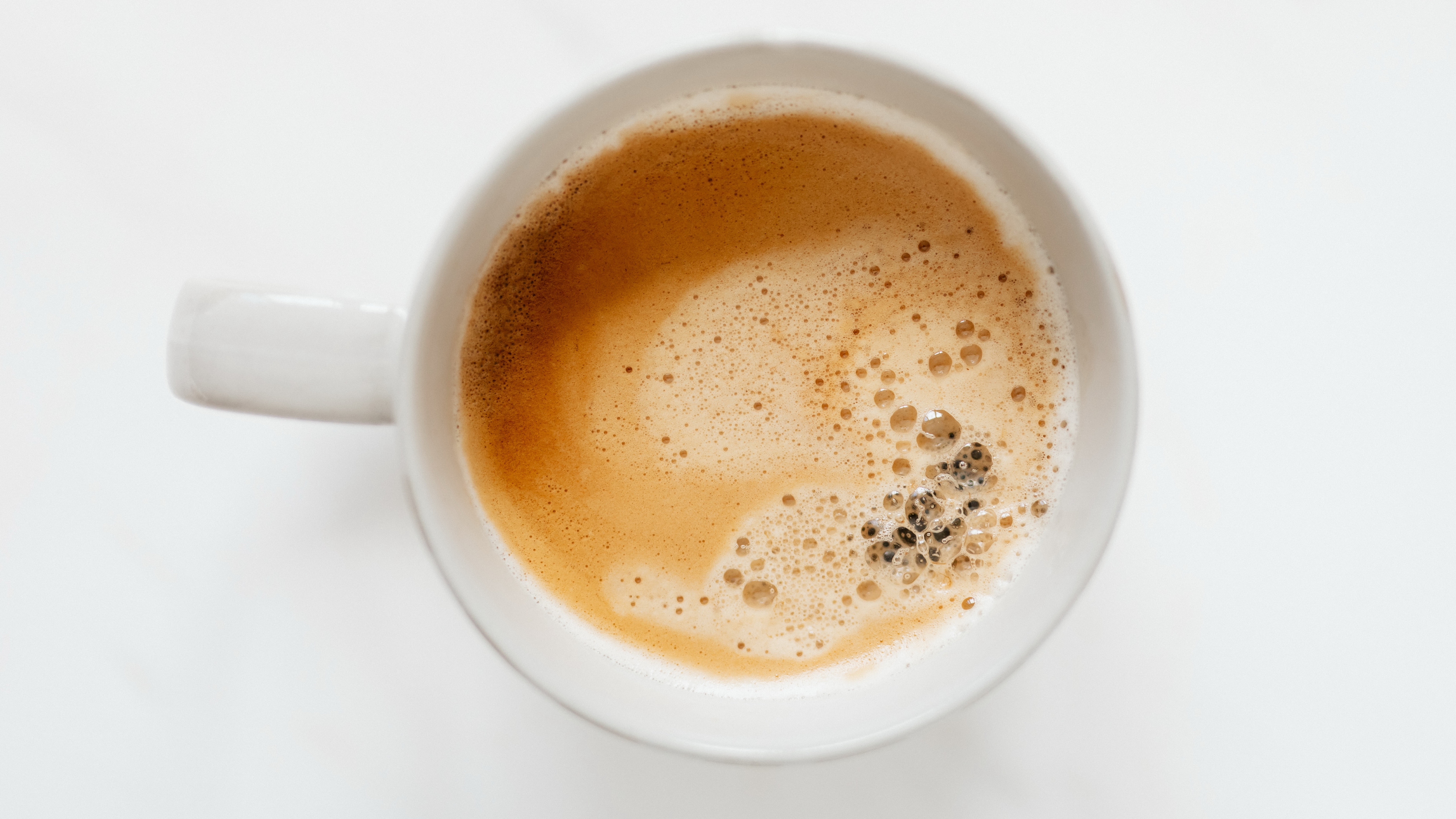 Description: A cup of coffee with a lot of brown stuff in it on a white table top with a white background.