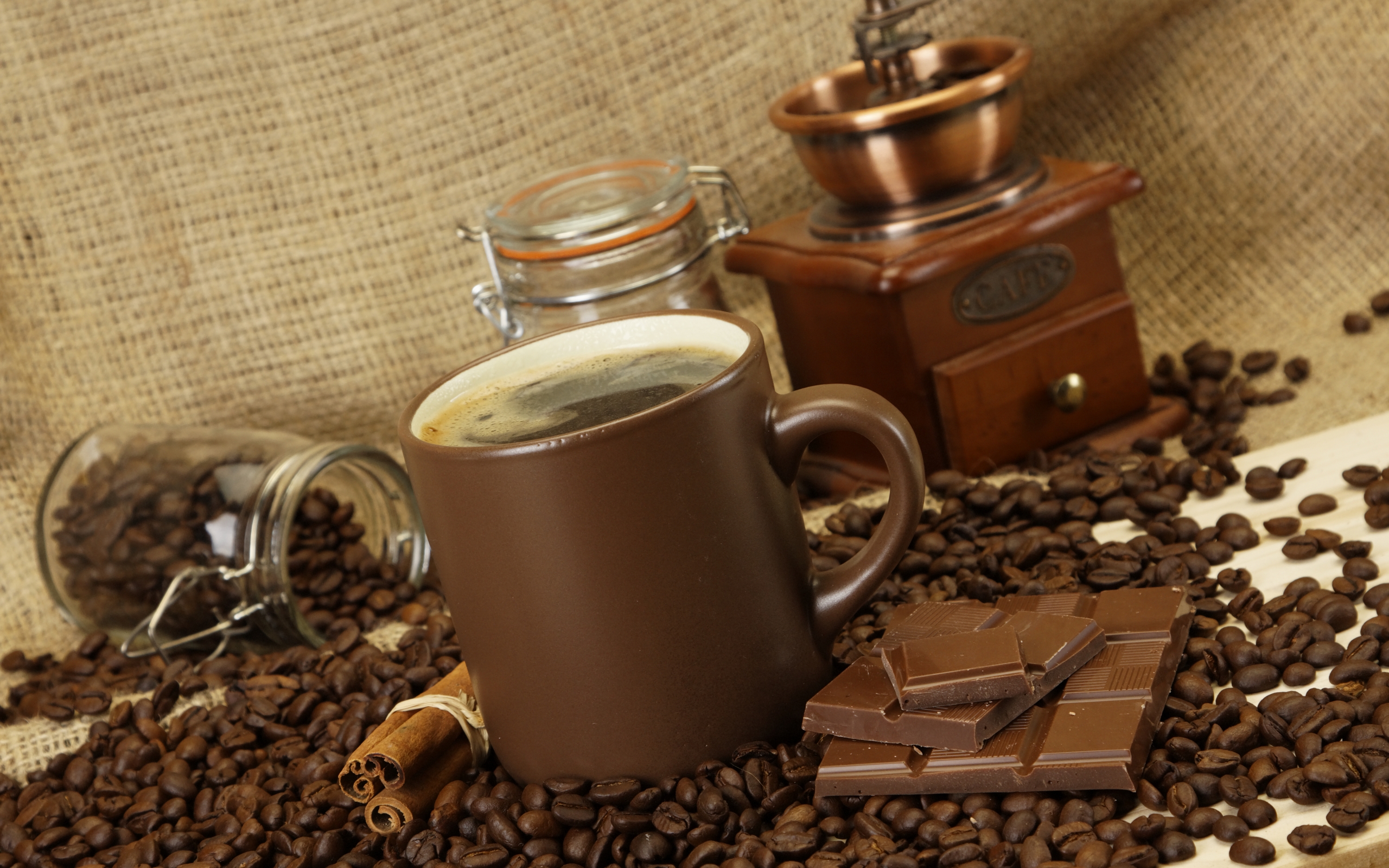 Description: A cup of coffee and some chocolate on a table with coffee beans and a grinder on the table.