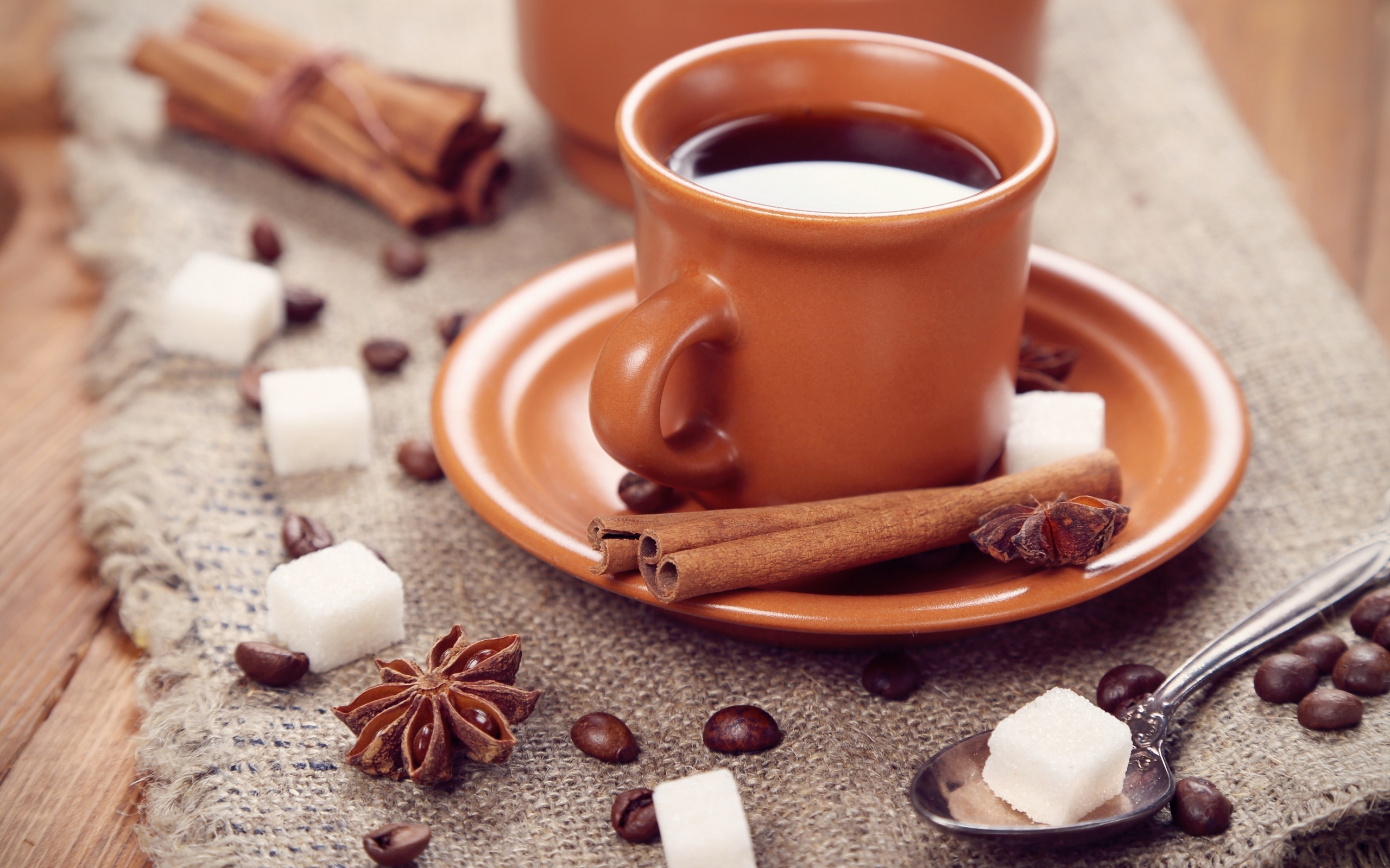 Description: A cup of coffee and cinnamon on a plate with a spoon and cinnamon sticks on a table cloth with a spoon.