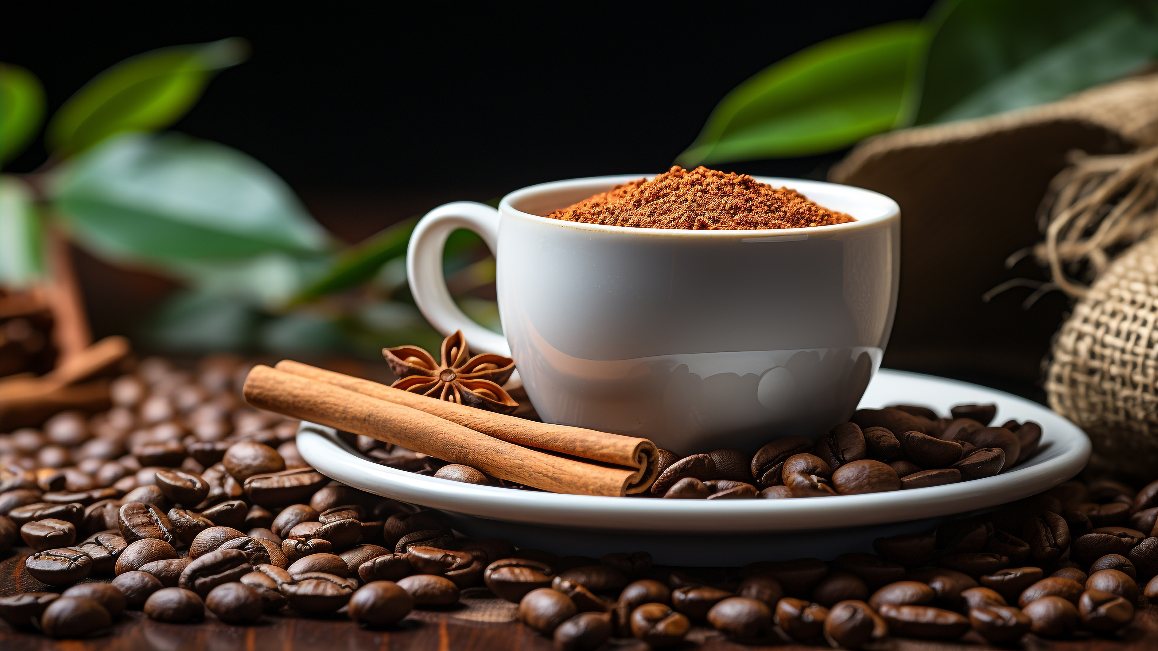 Description: A cup of coffee with cinnamon and cinnamon sticks on a plate with coffee beans and cinnamons around it.