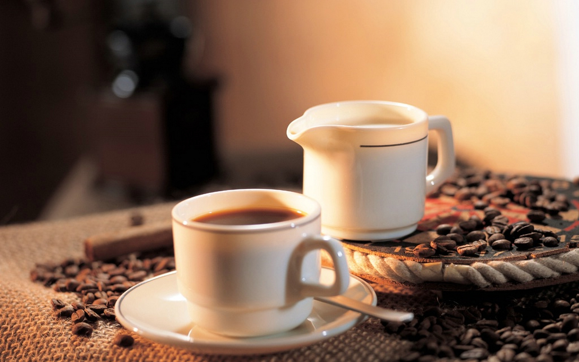 Description: A cup of coffee and a plate of coffee beans on a tablecloth with a plate of coffee beans.