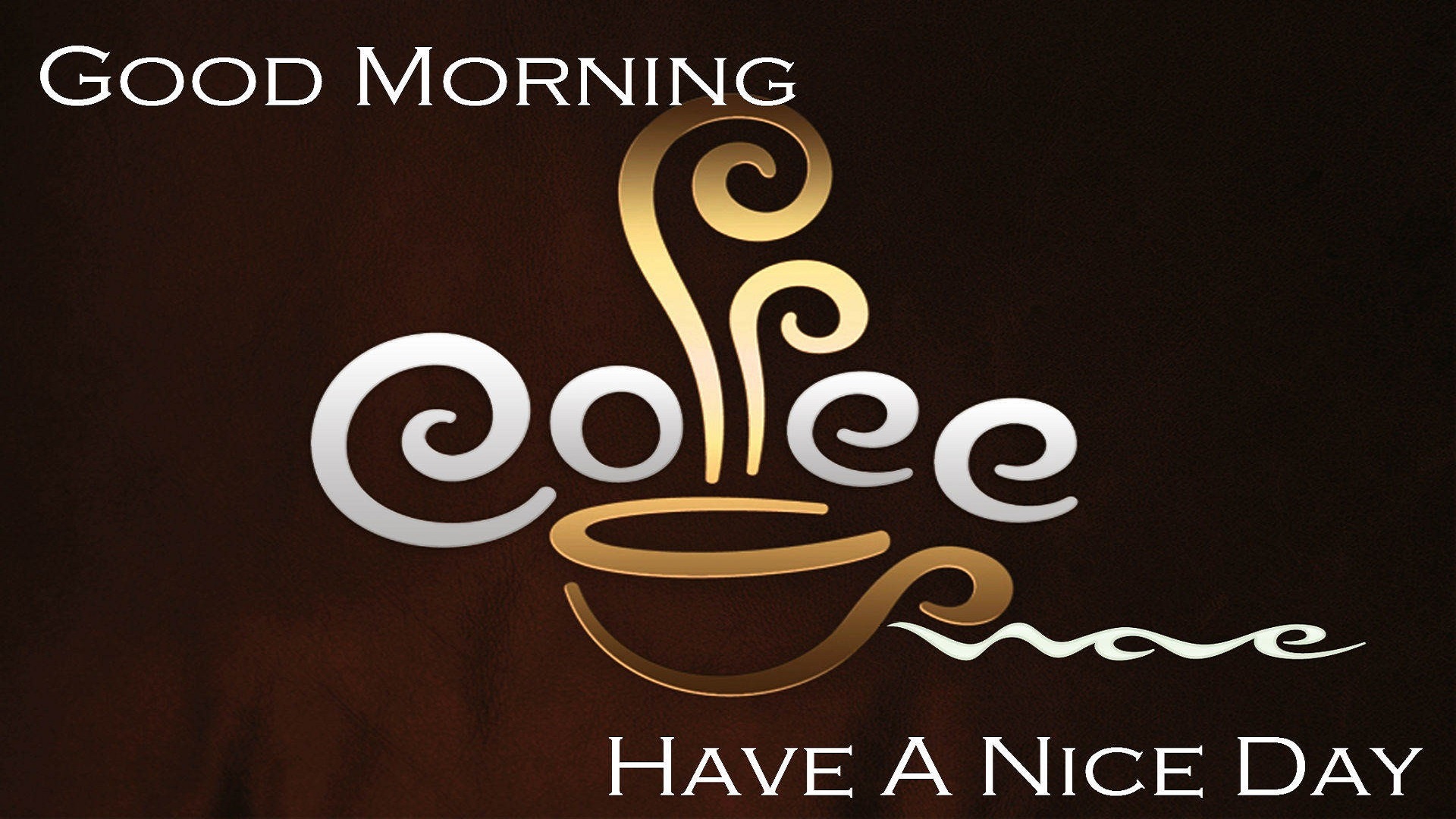 Description: A coffee cup with a swirly design on it and the words good morning have a nice day written in cursive writing.