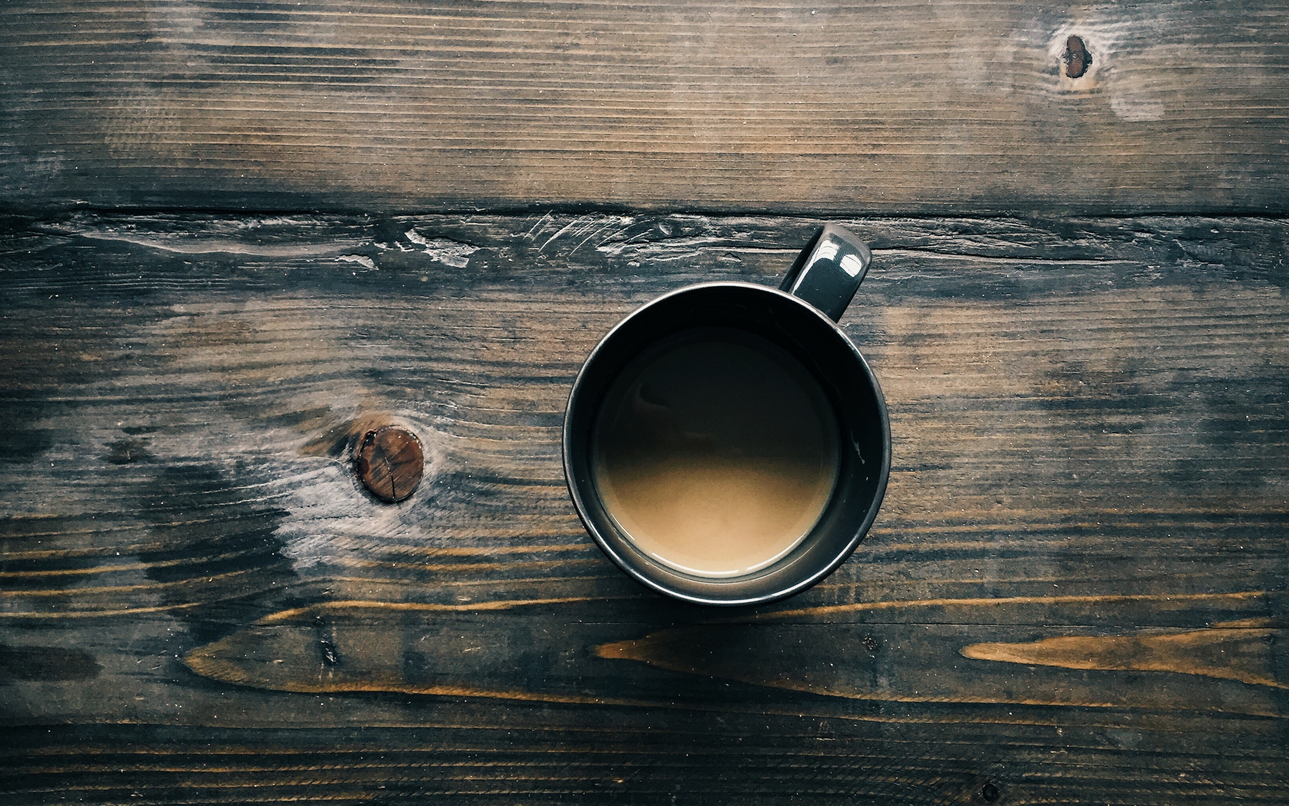Description: A cup of coffee on a wooden table with a spoon and a spoon rest on the table top of the cup.
