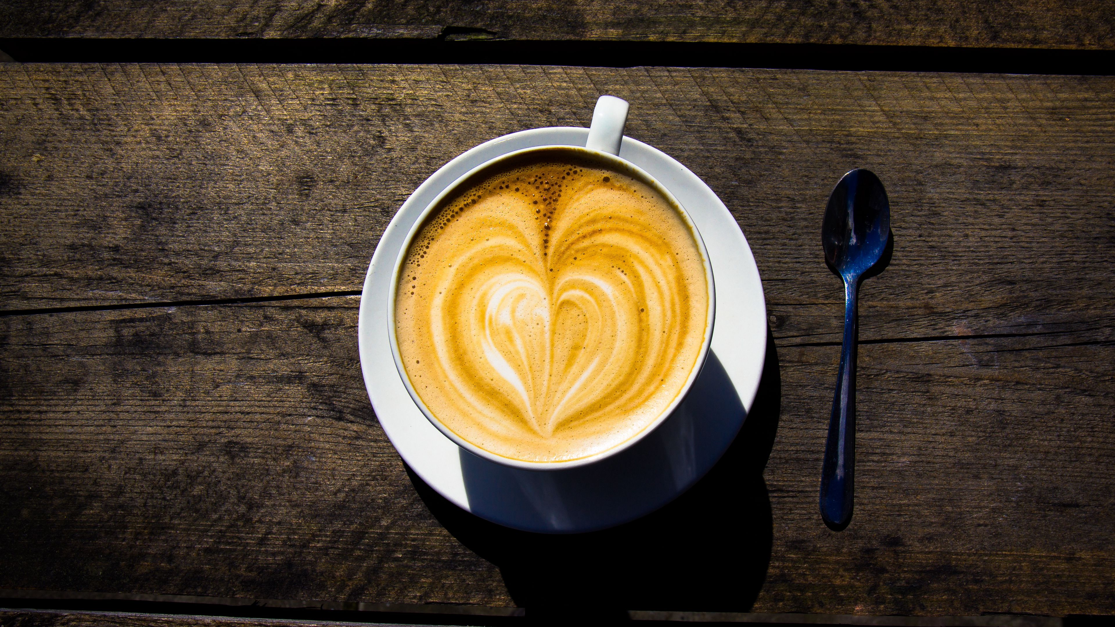 Description: A cup of coffee with a heart drawn in it and a spoon on a wooden table top with a spoon.