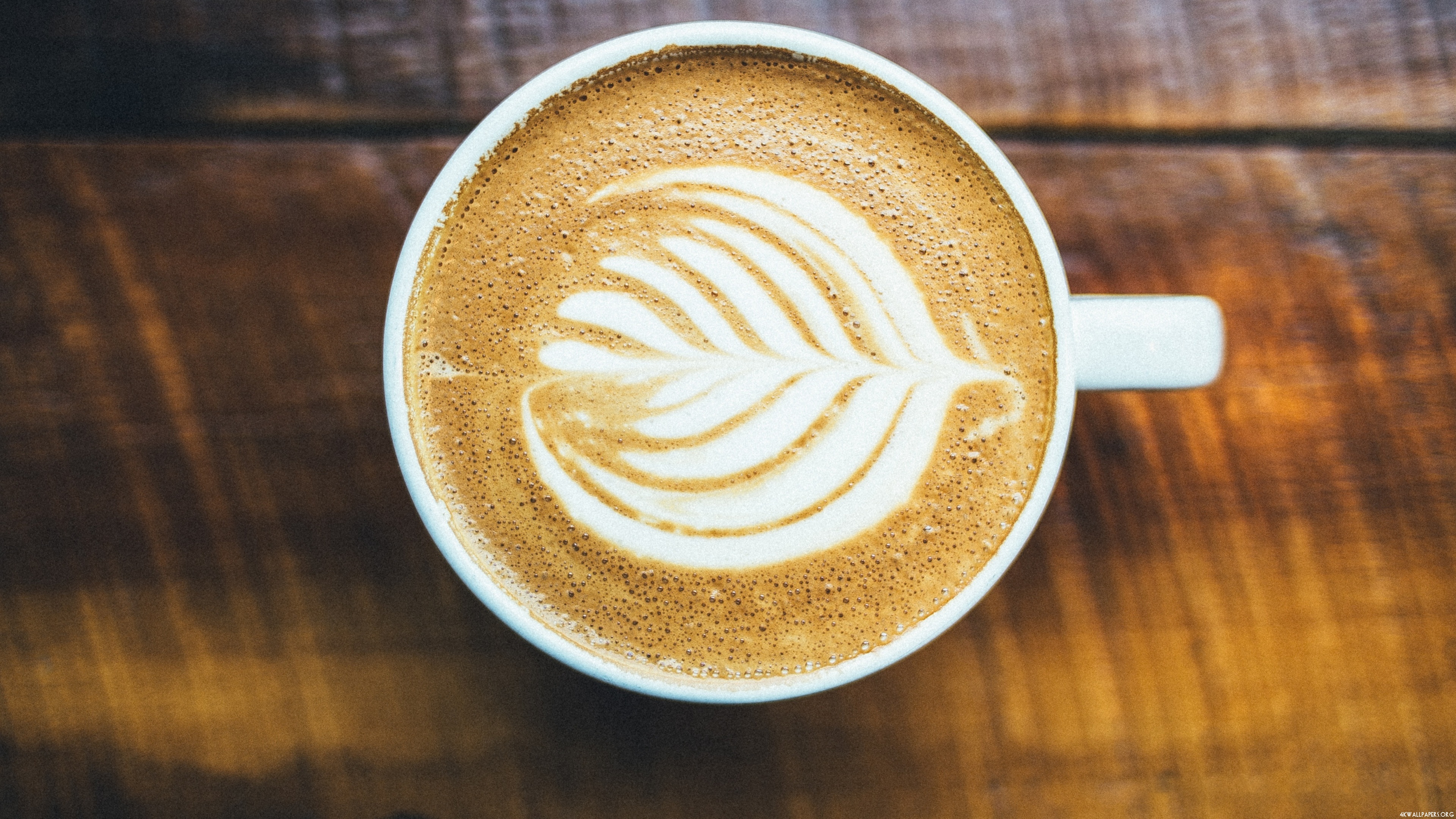 Description: A cup of coffee with a leaf on top of it on a table with a wooden surface in the background.