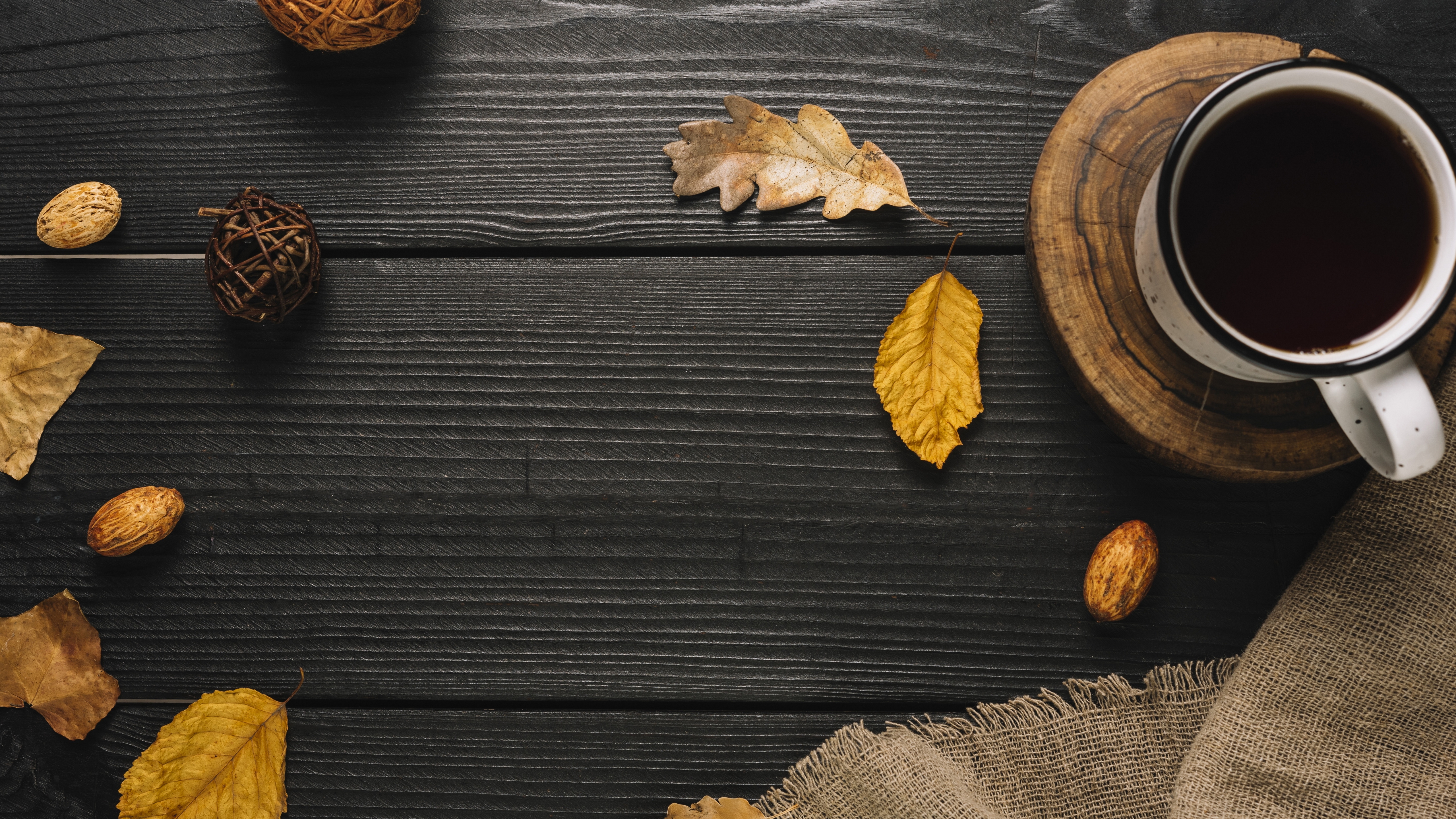 Description: A cup of coffee and some leaves on a table with a cloth and a cloth bag on it and a wooden spoon.