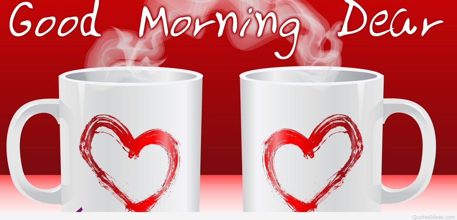 Description: Two coffee mugs with a heart on them with the words good morning dear written on them and a red background.