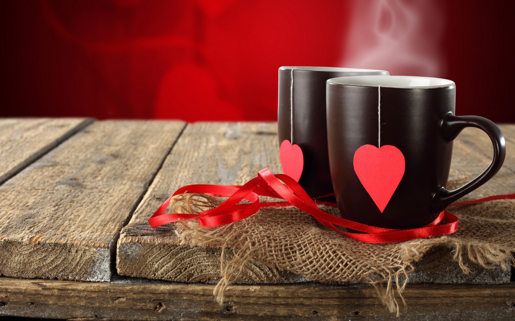 Description: Two coffee mugs with hearts on them on a table with a red ribbon around them and a red background.