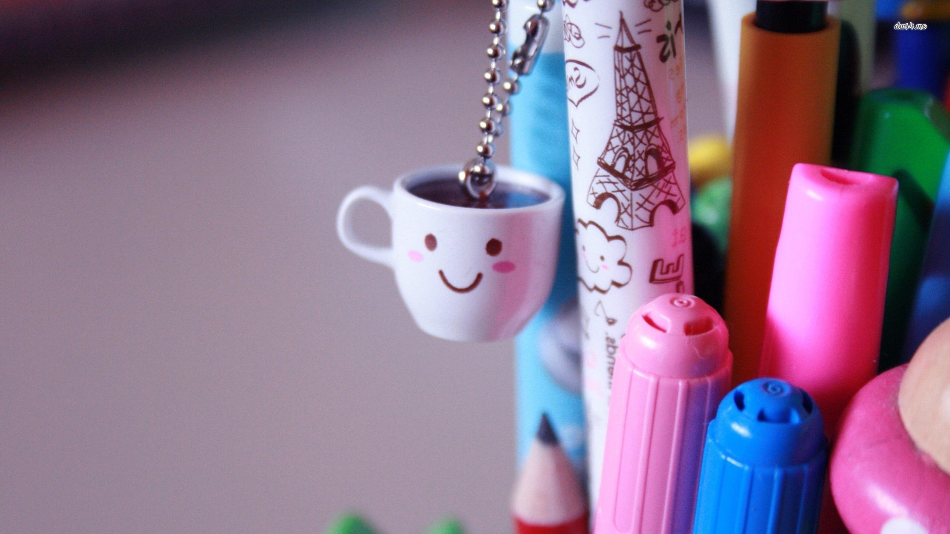 Description: A cup of coffee and a pen holder with a chain attached to it.