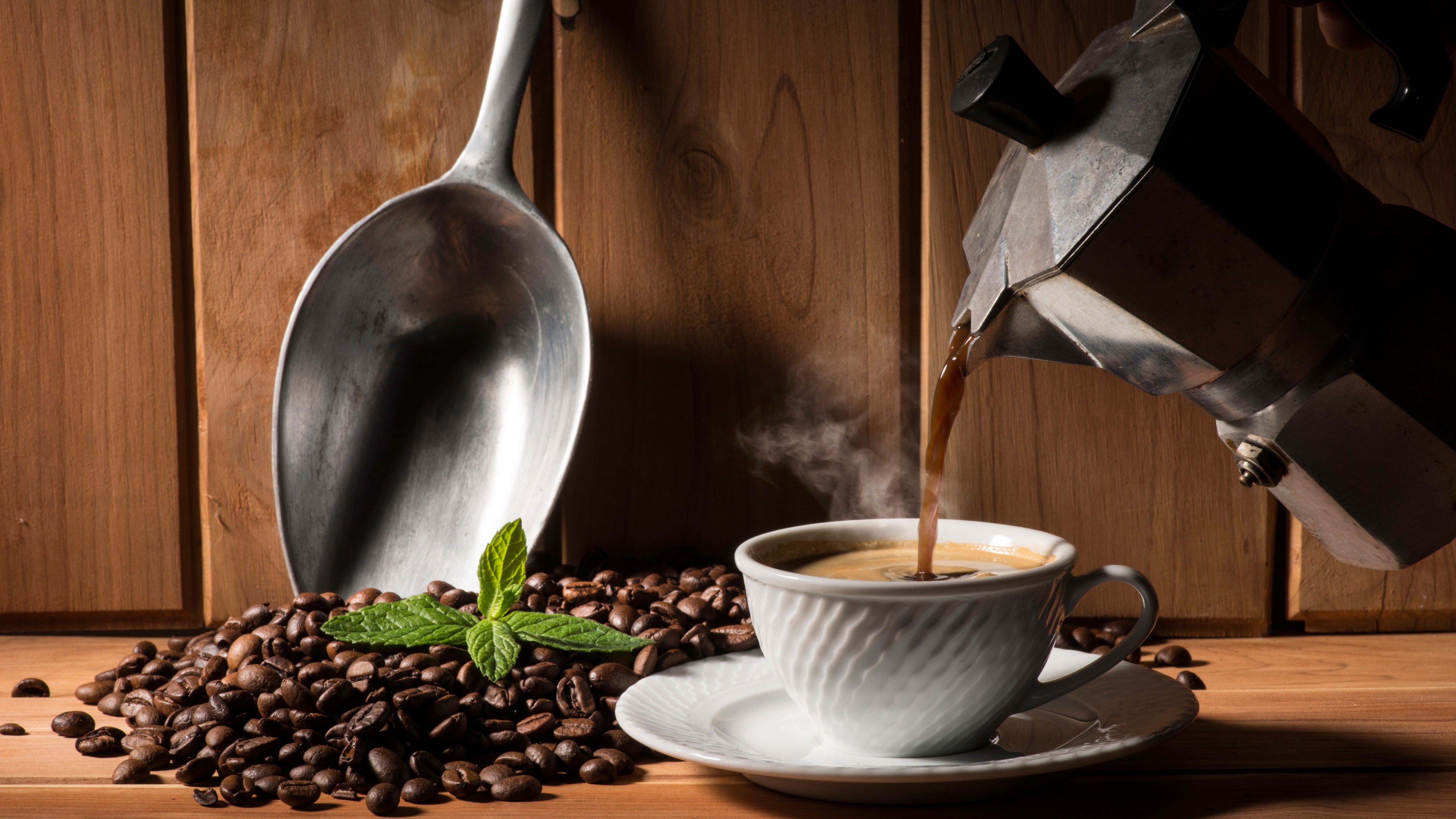 Description: A cup of coffee being poured into a cup of coffee with a spoon and a scooper on a table.