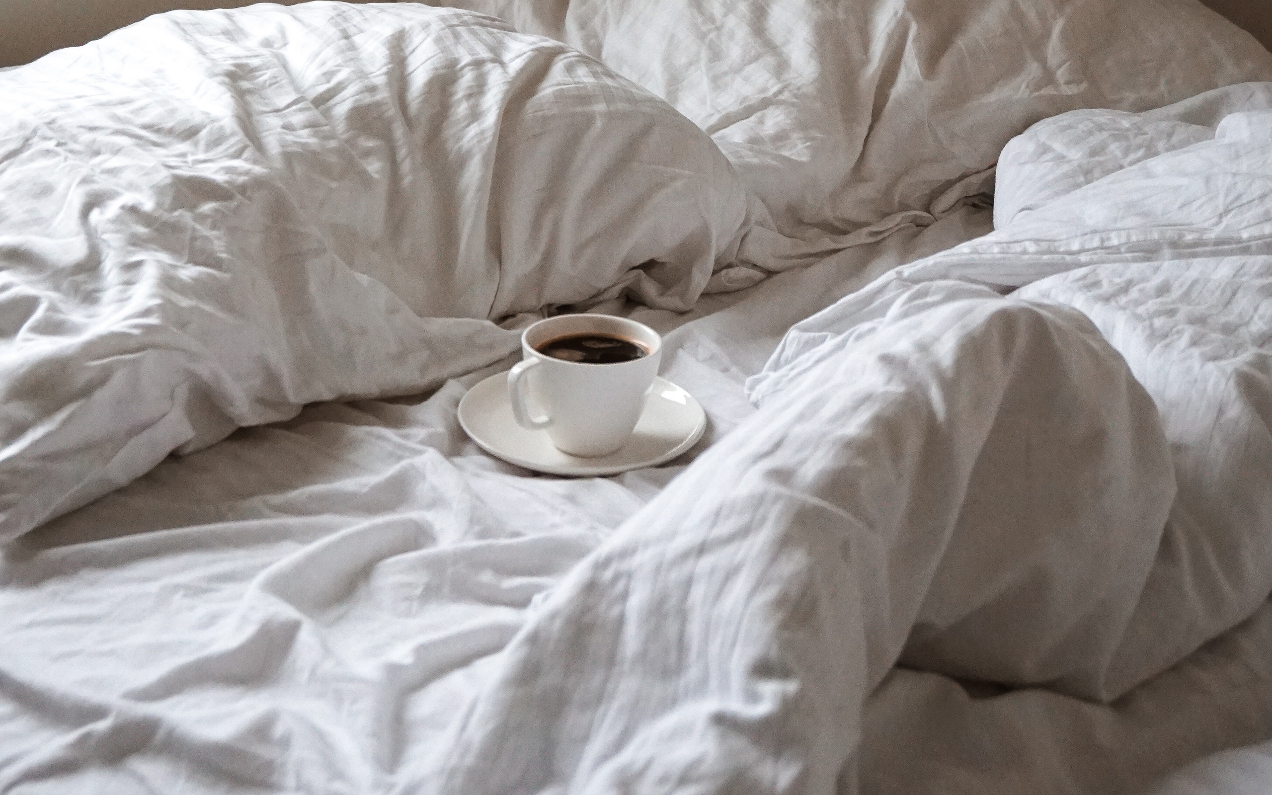 Description: A cup of coffee is on a saucer on a bed with white sheets and a blanket on the bed.
