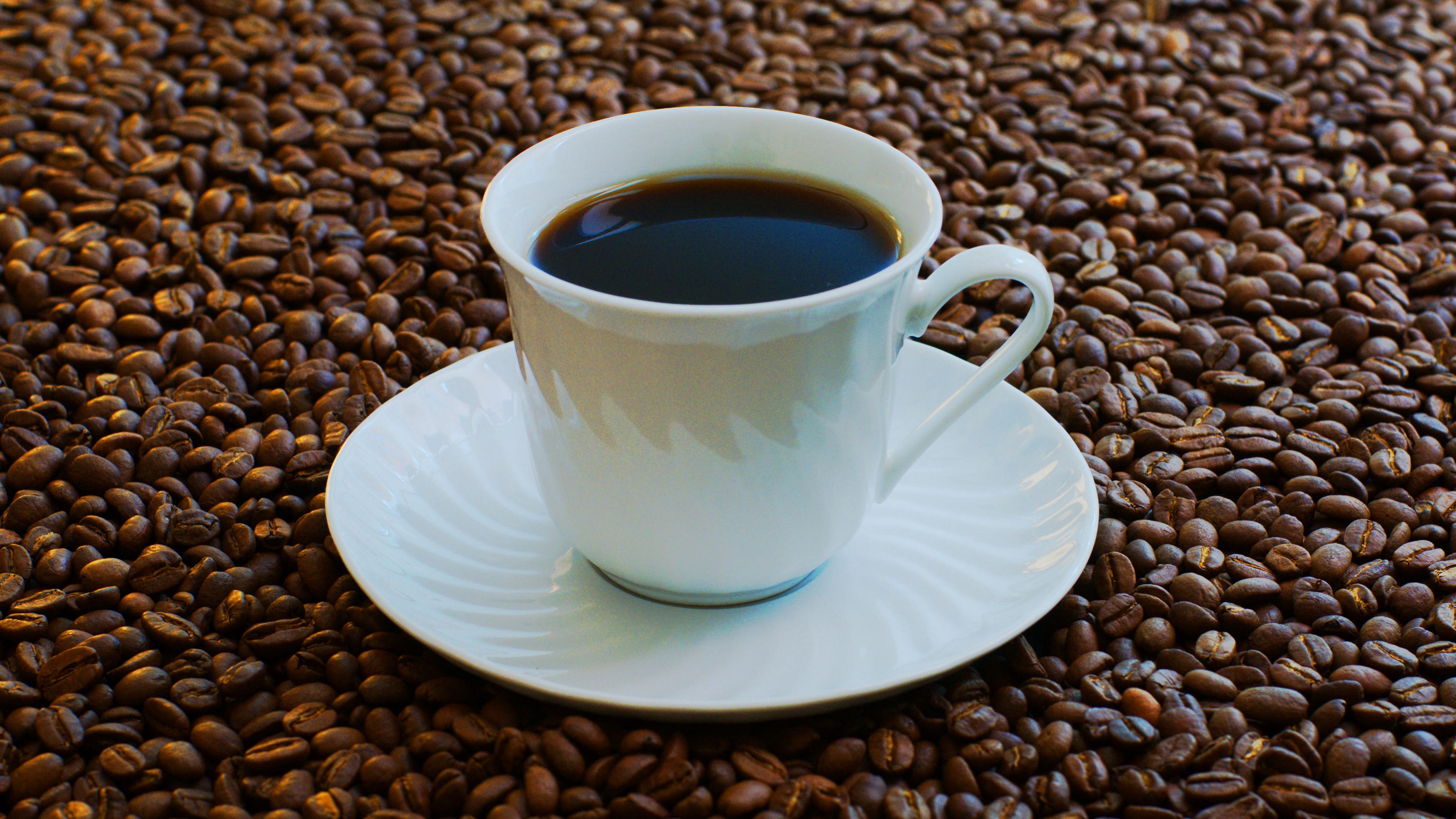 Description: A cup of coffee sitting on top of a saucer on a table covered in coffee beans.
