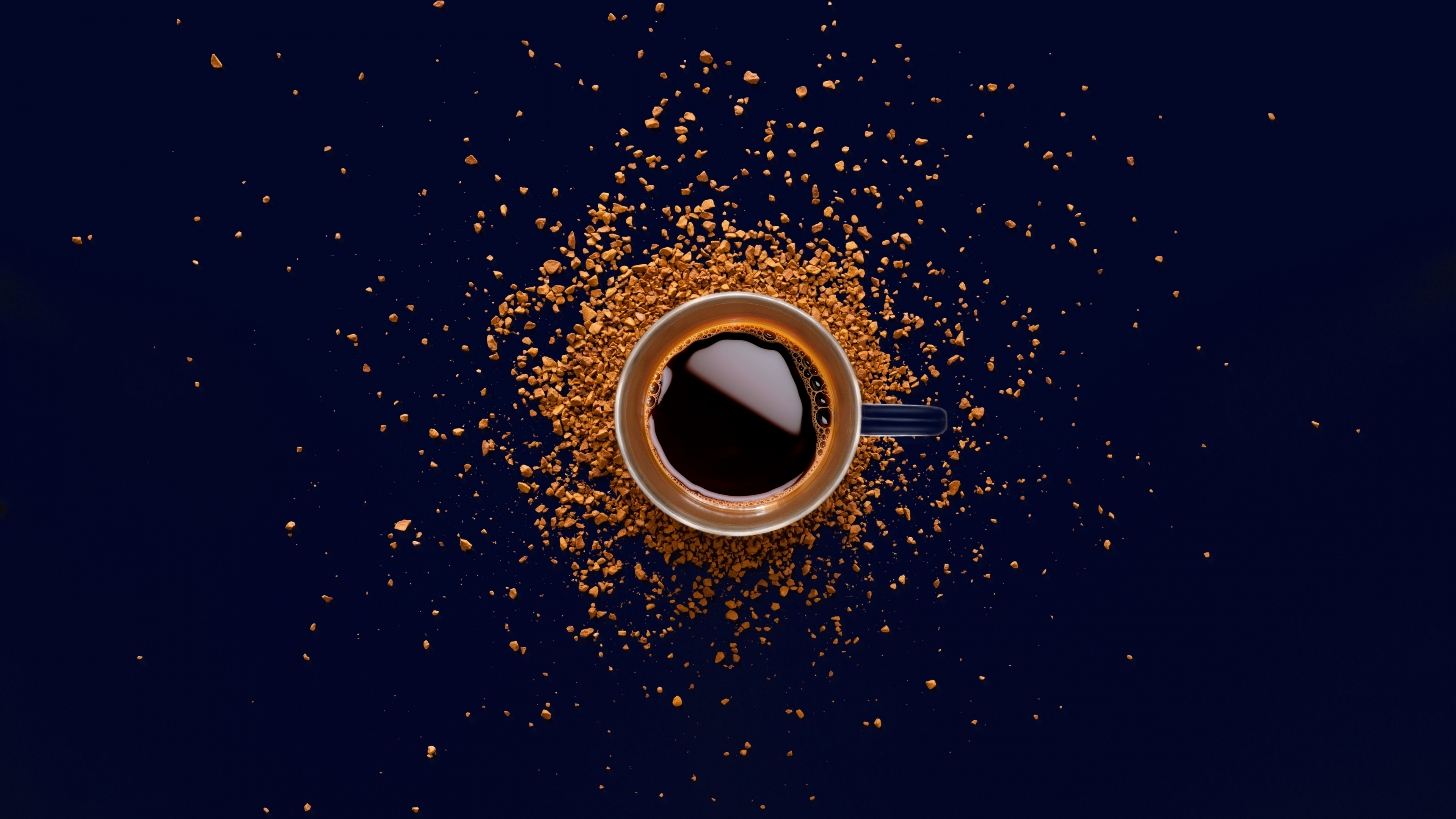 Description: A cup of coffee with a spoon in it surrounded by grains of gold flakes on a dark blue background.