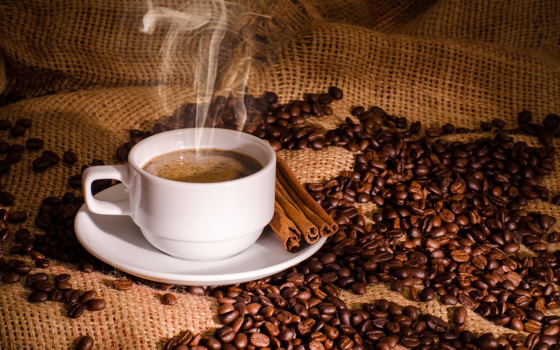Description: A cup of coffee with steam rising out of it on a saucer surrounded by coffee beans and cinnamon sticks.