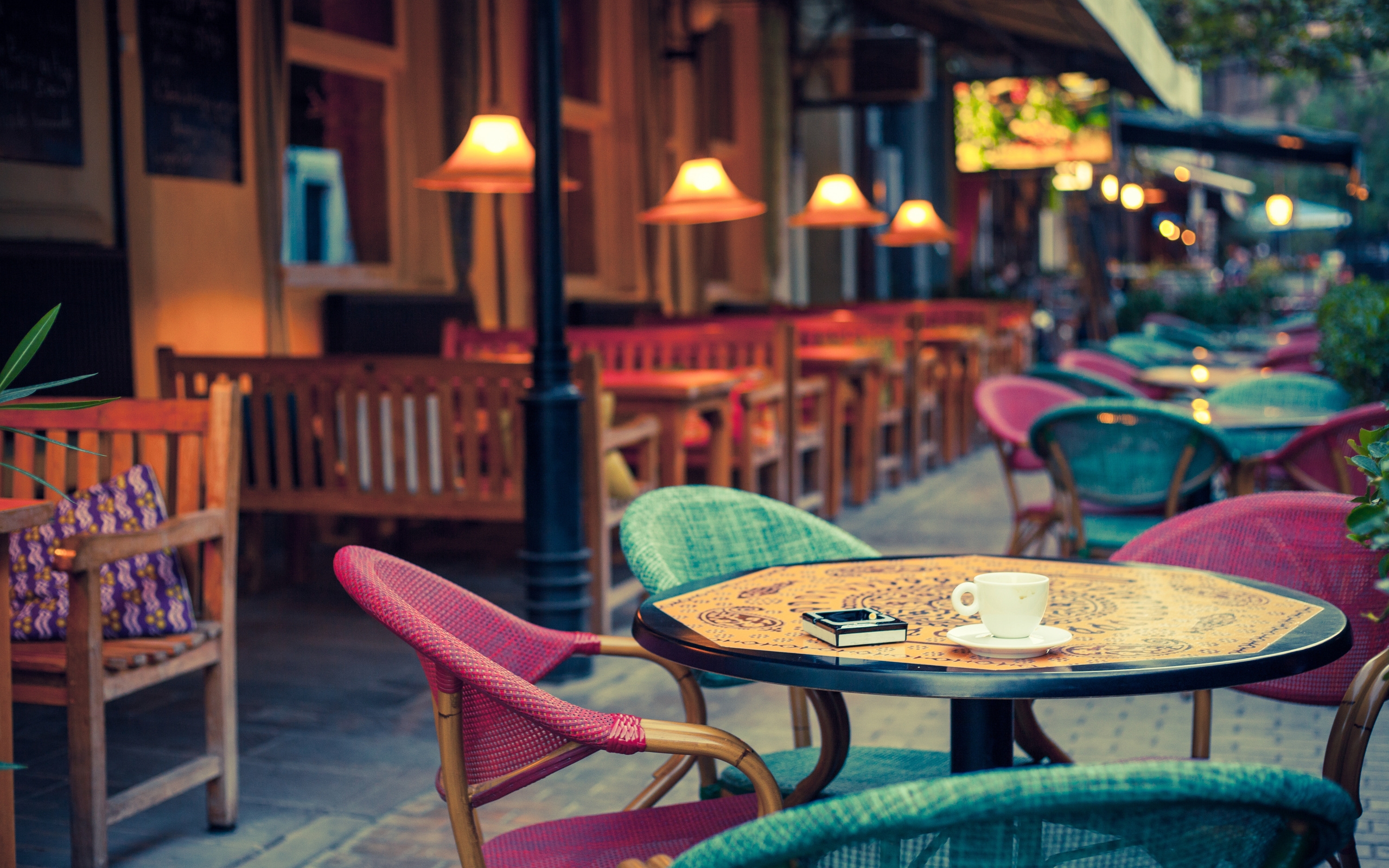 Description: A table with a cup of coffee on it in a restaurant with chairs and tables outside of it and a lamp post.
