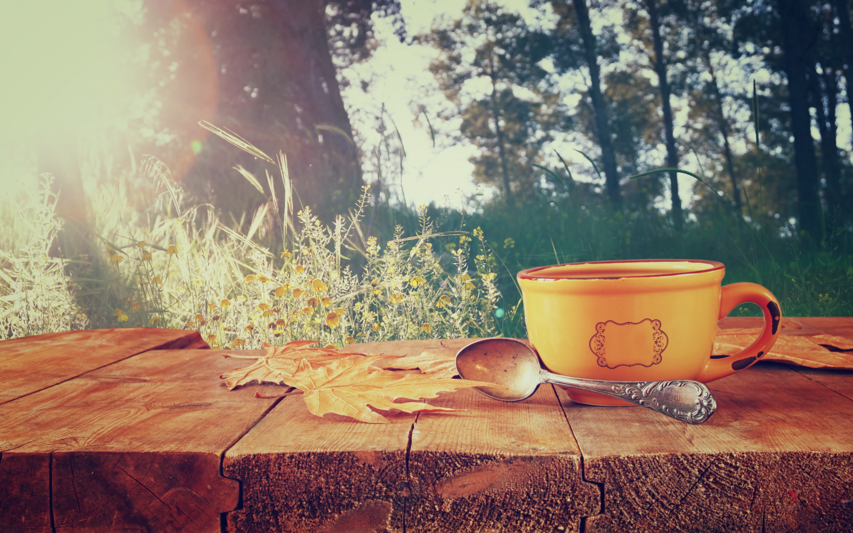 Description: A cup of coffee on a wooden table with a spoon and a leaf on it with a forest in the background.
