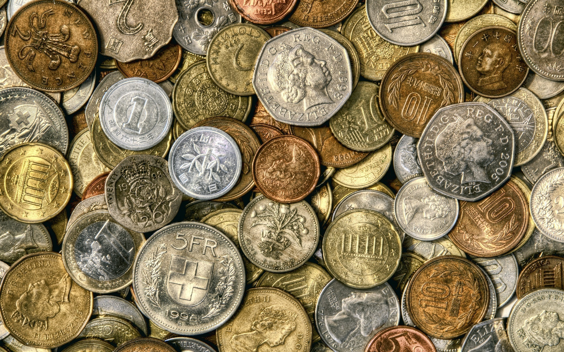 Description: A pile of different types of coins with a lot of them in the middle of the picture.