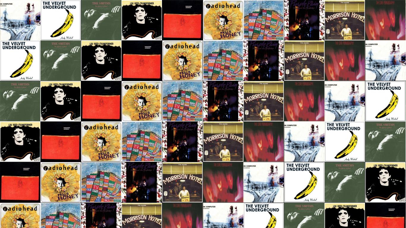 Description: A collage of different colored records with a picture of a man in the middle of them and a woman in the middle.