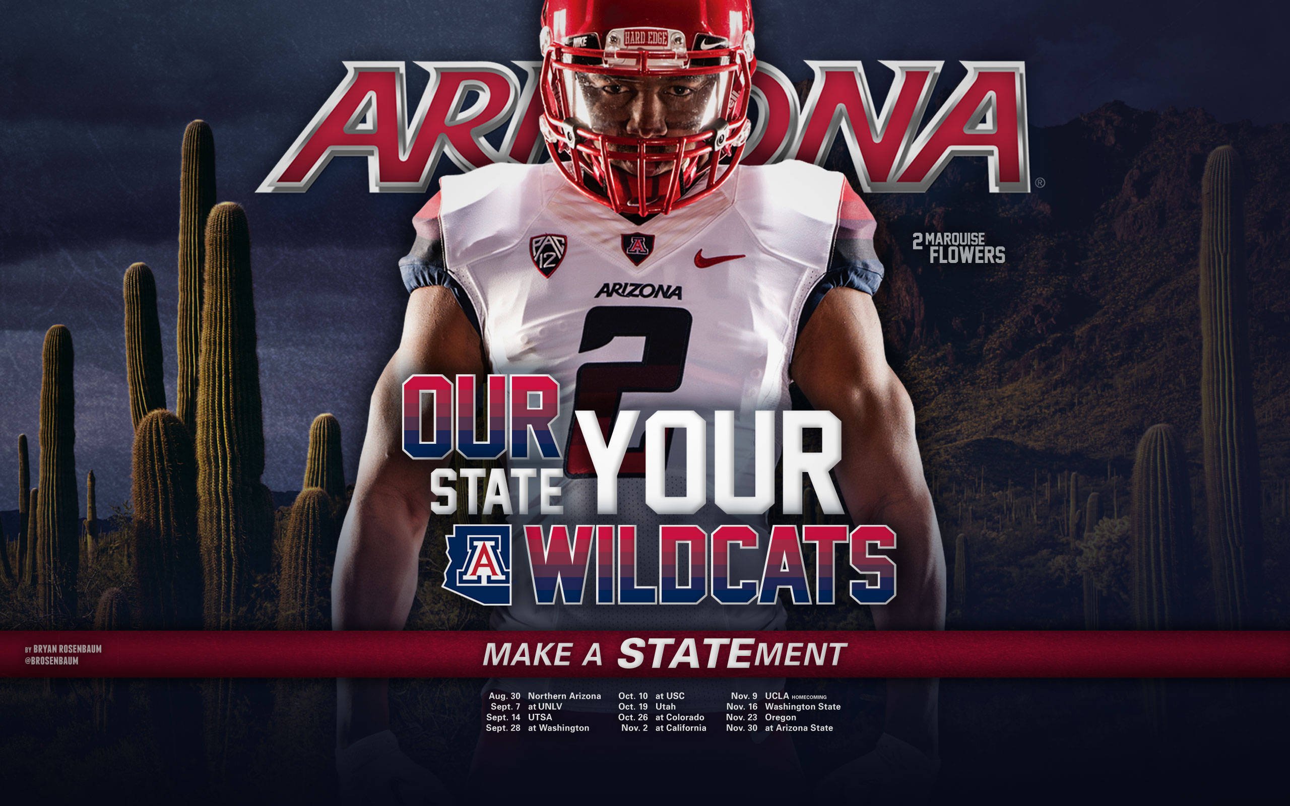 Description: A poster for a college football team featuring a football player in a helmet and a cactus background with the words arizona our state.