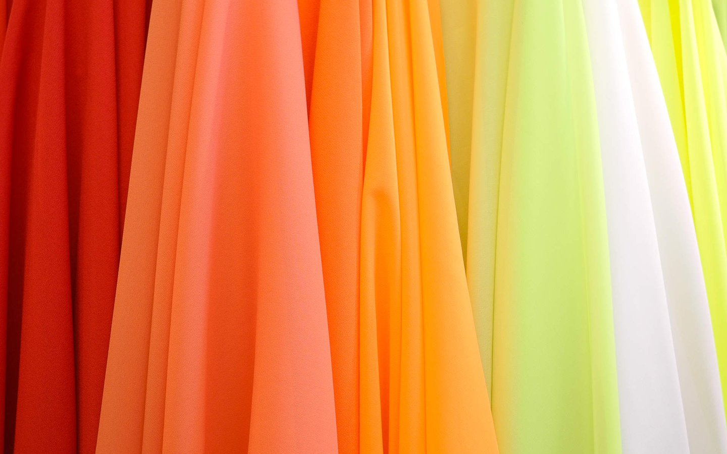 Description: A bunch of different colored dresses hanging up in a store window with a red.