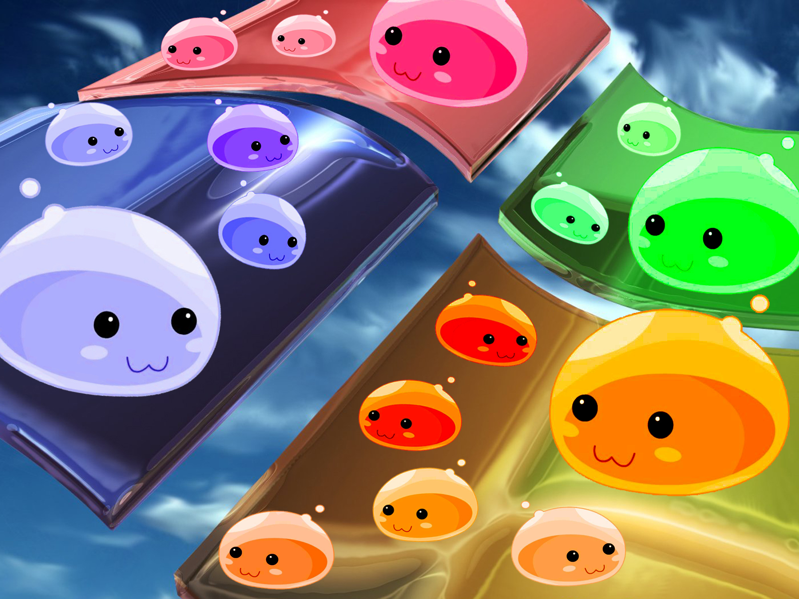 Description: A bunch of different colored objects in the sky with clouds in the background and a blue sky with clouds.