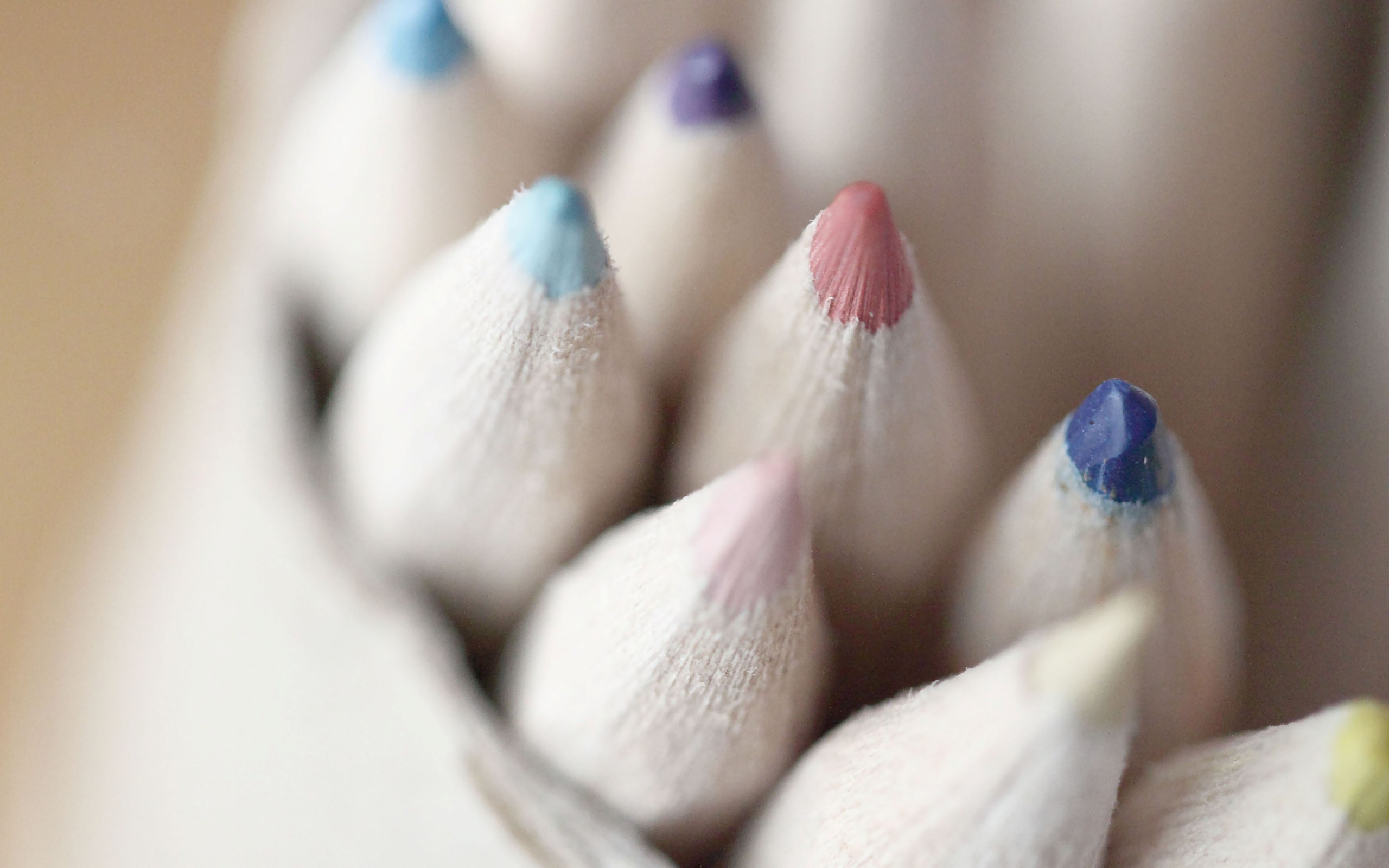 Description: A close up of a bunch of colored pencils in a cup with a white curtain in the background.