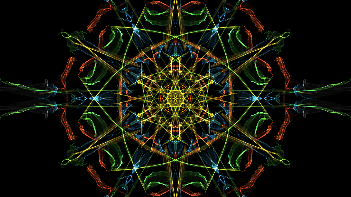 Description: A colorful abstract design with a black background and a black background with a yellow and blue flower in the center.
