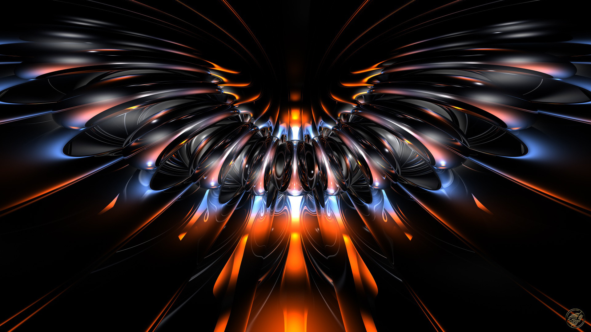 Description: A very colorful abstract design with a black background and a red and blue background with a large wing like structure.