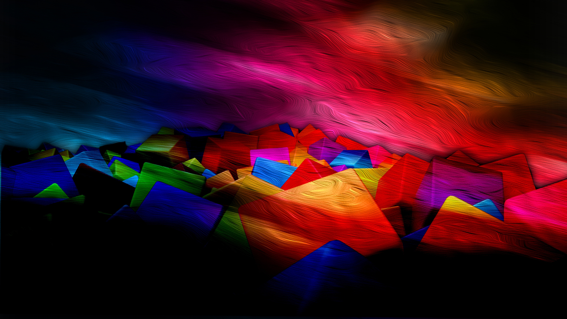 Description: A colorful abstract painting of a mountain range with a rainbow sky in the background and a black background with a white border.