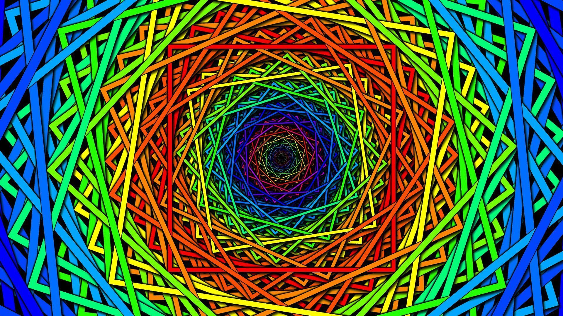 Description: A colorful abstract painting of a spiral of colored sticks and sticks in a blue.