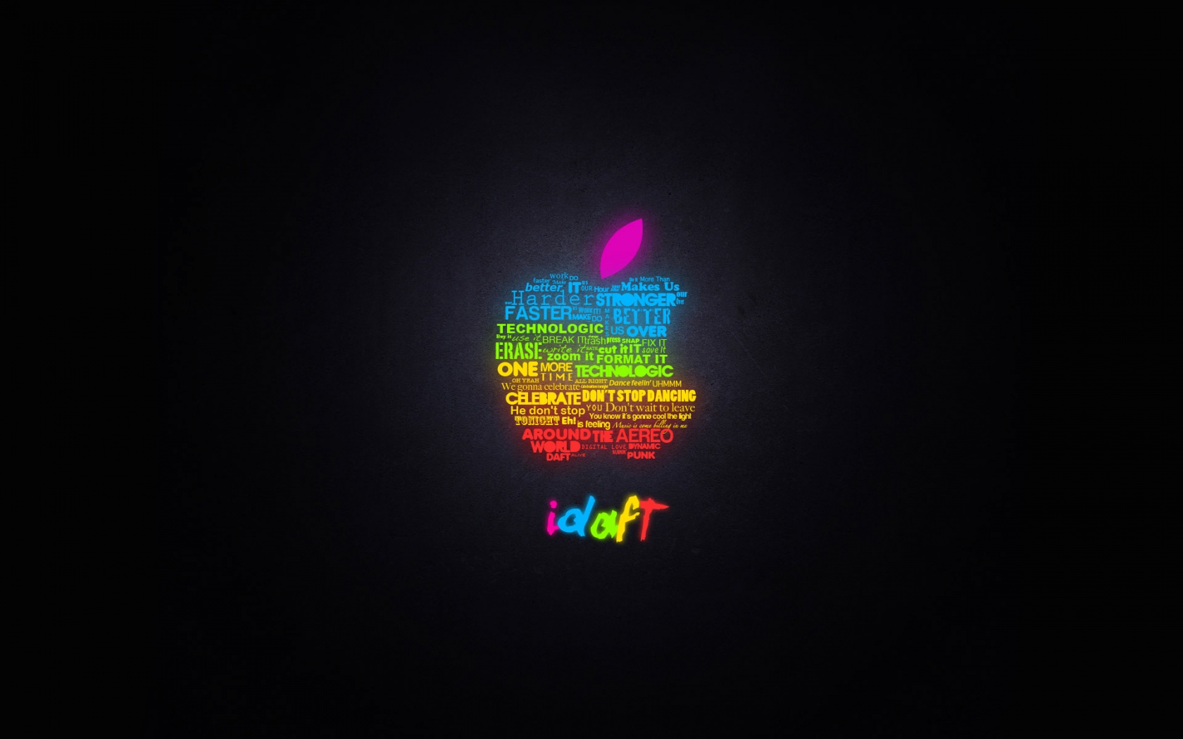 Description: A colorful apple logo is shown in the dark with the word'apple'written in it's letters.