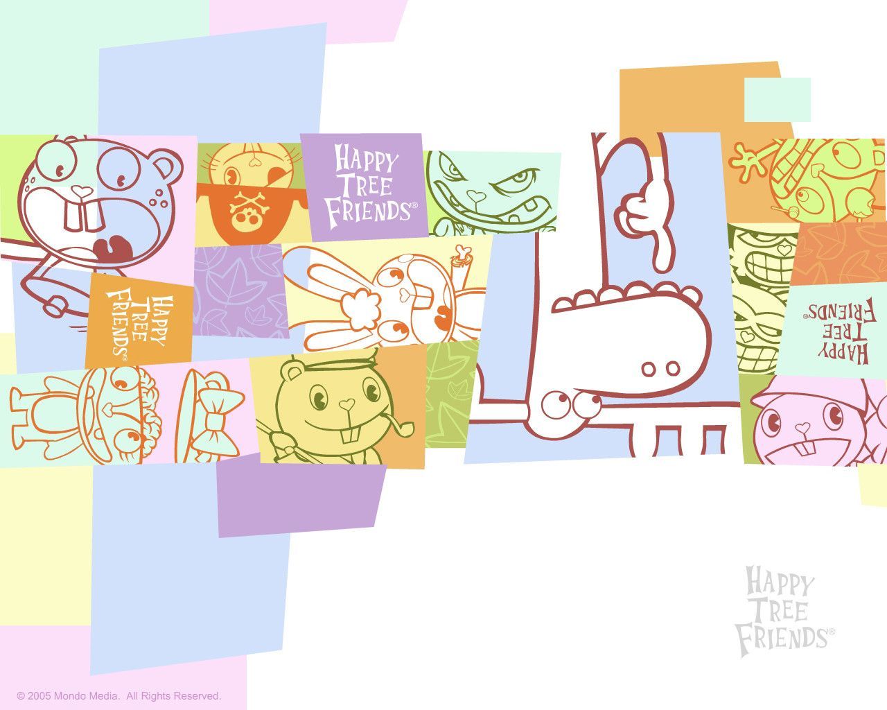 Description: A colorful background with a bunch of different cartoon characters on it's side and a happy tree friends logo on the front.