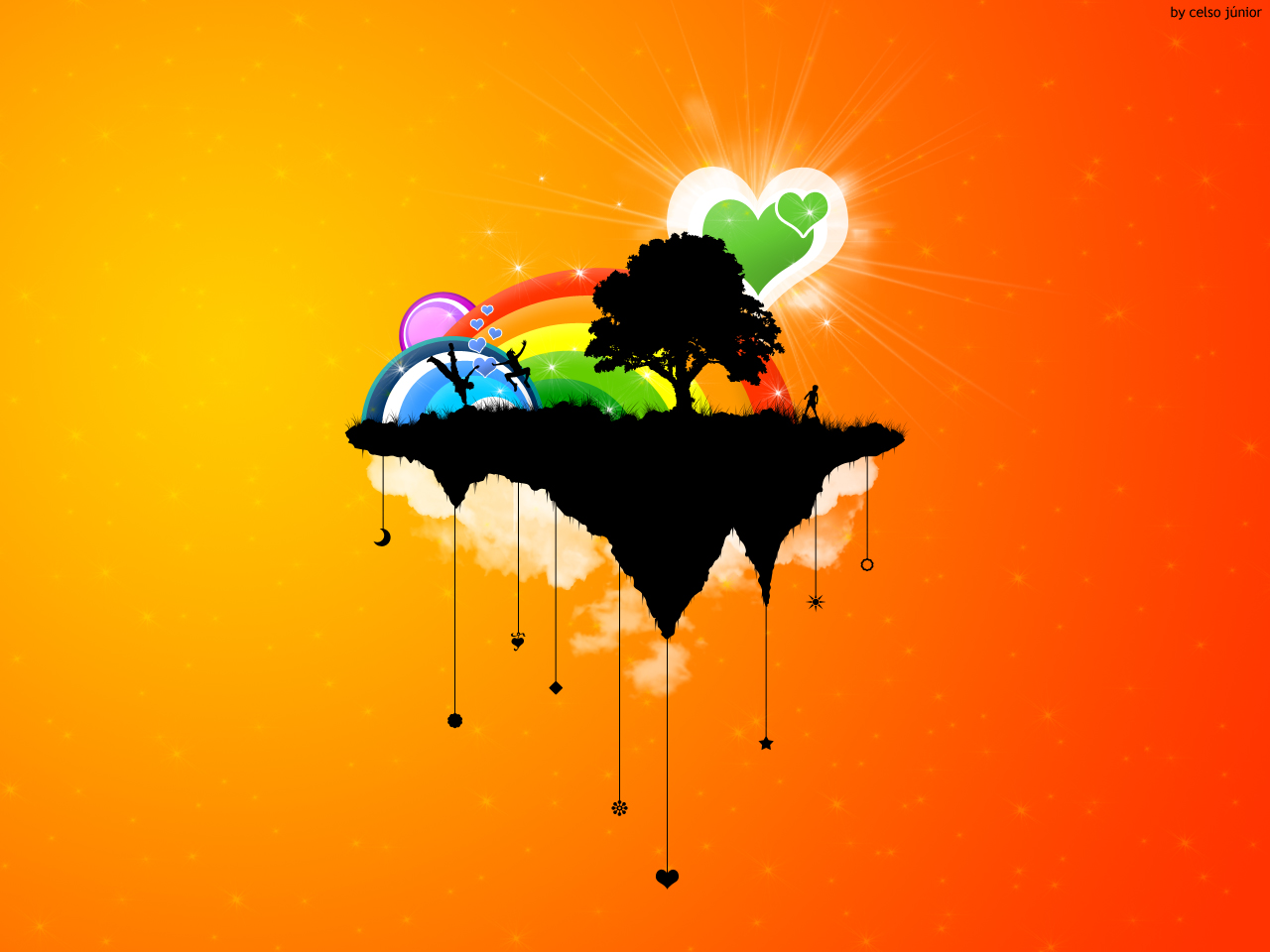Description: A colorful background with a tree and a rainbow on a hill with a heart shaped tree on top of it.