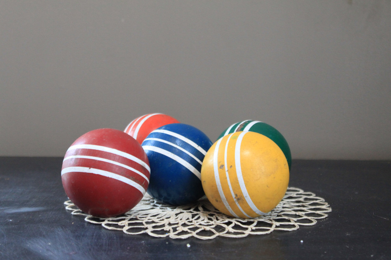 Description: Three colorful balls sitting on a doily on a table top with a gray wall in the background and a white doily.