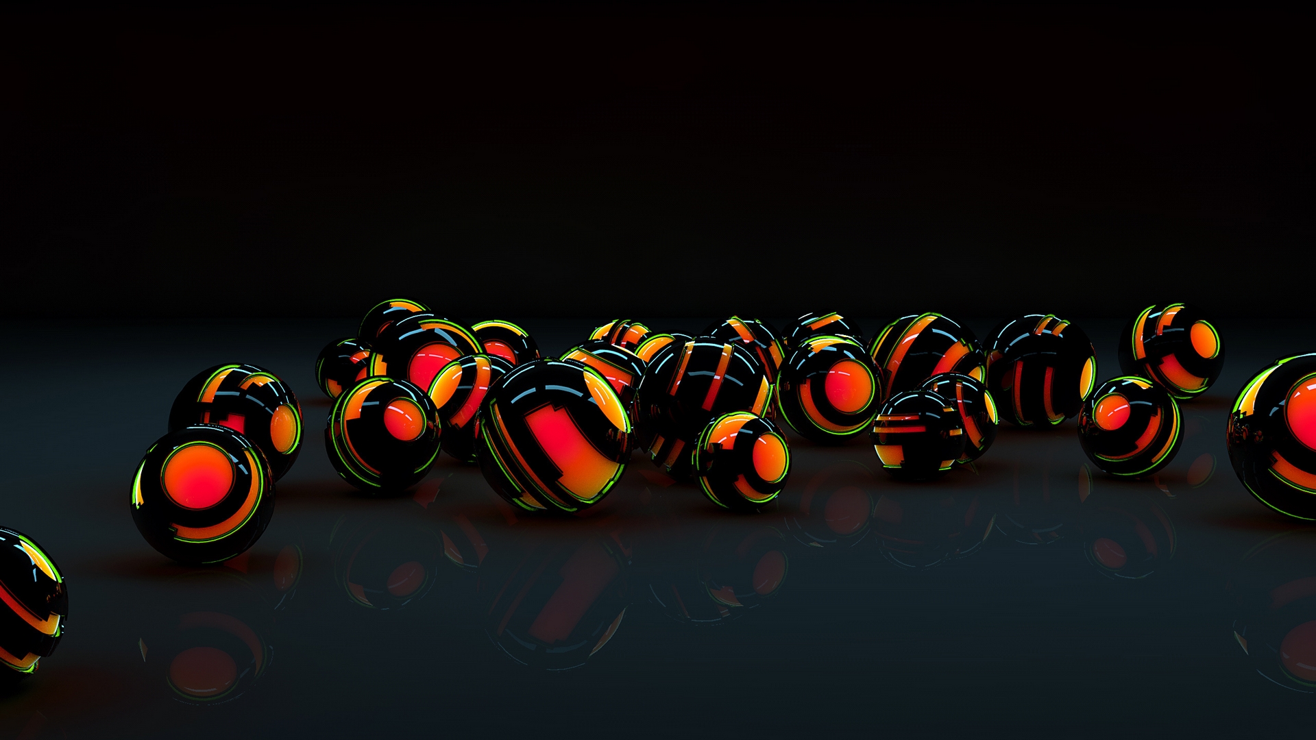 Description: A group of balls with different colors on them in a dark room with reflections on the floor and a black background.