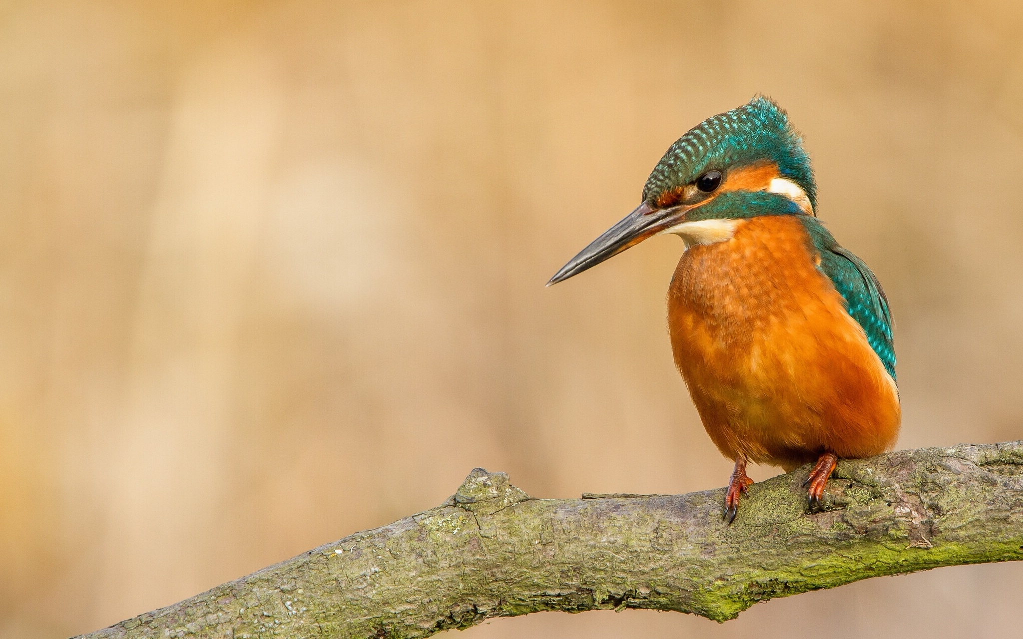 Description: A colorful bird sitting on a branch with a blurry background of grass and trees in the background.