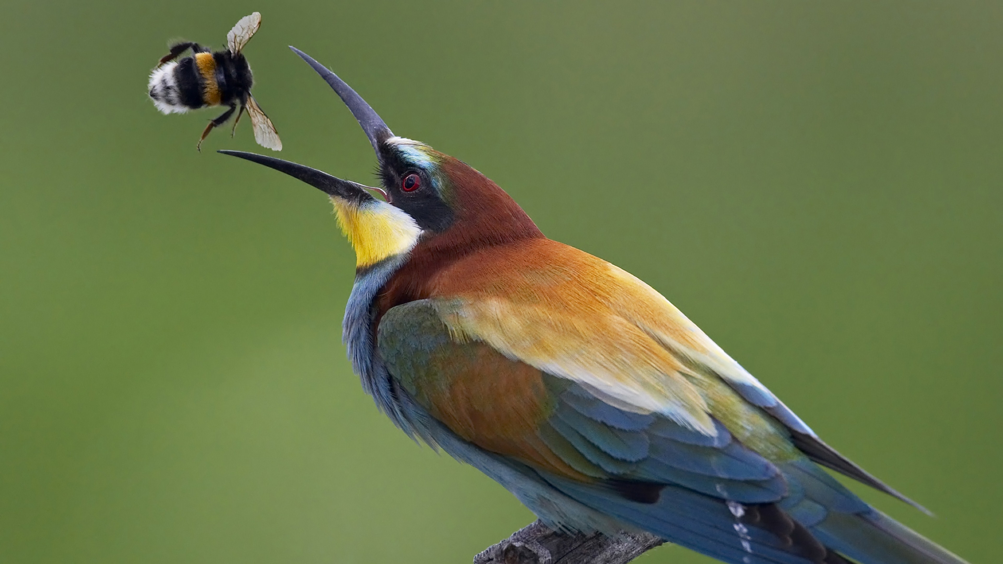 Description: A colorful bird with a bug in its mouth and a bee in its mouth on a branch with a green background.