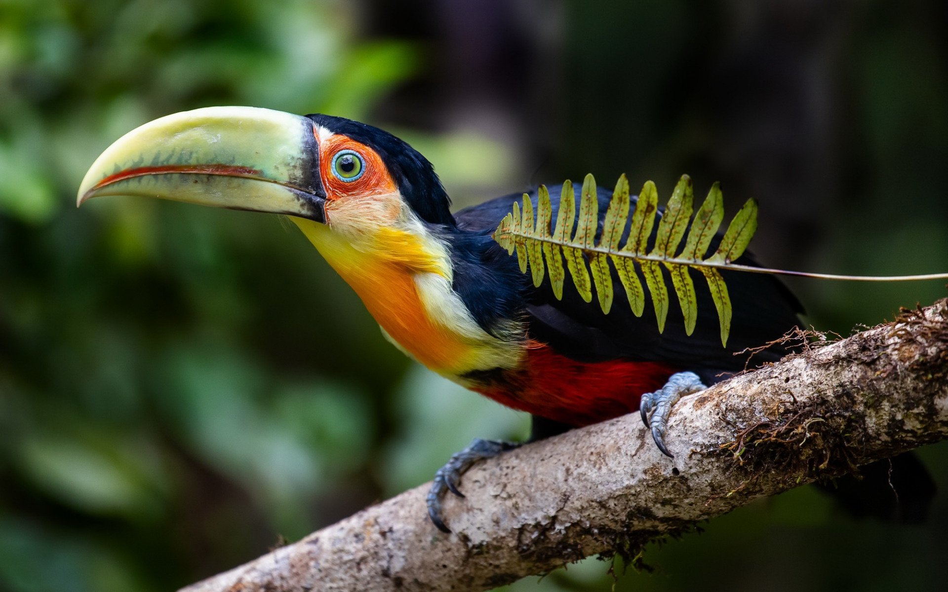 Description: A colorful bird with a long beak and a long bill on a branch with a fern in its mouth.
