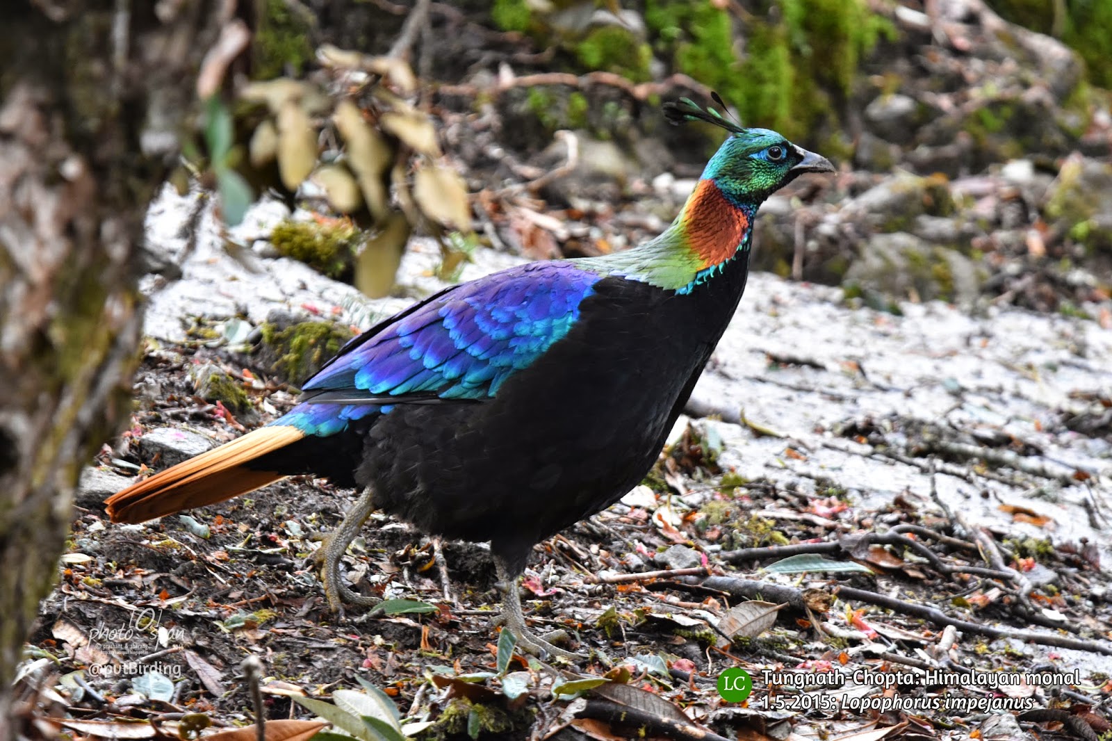 Description: A colorful bird standing on the ground next to a tree trunk and leaves on the ground and a tree trunk.